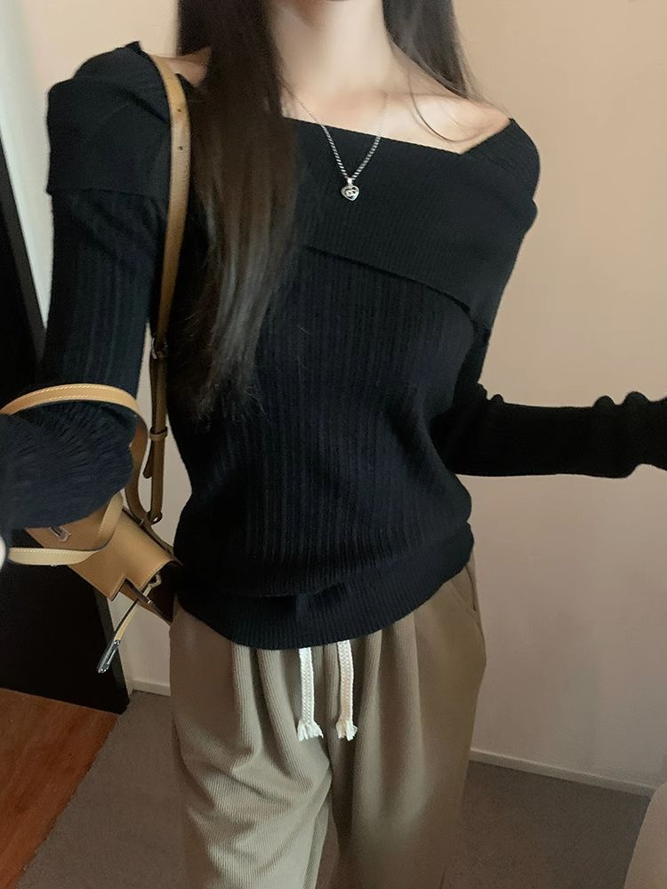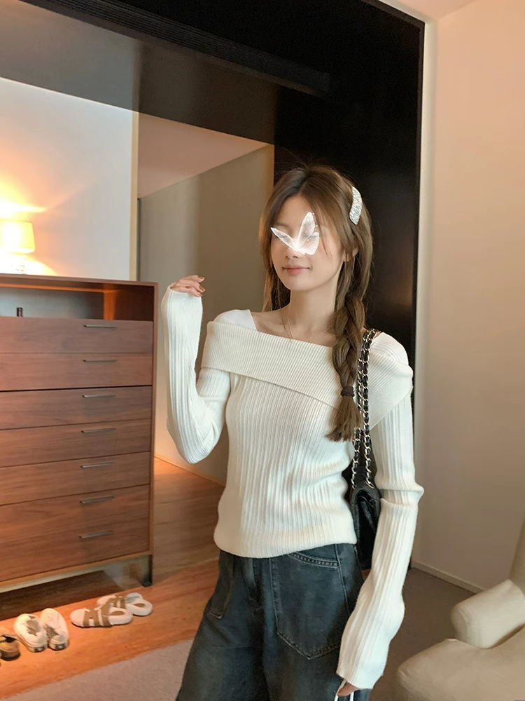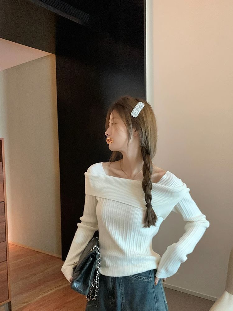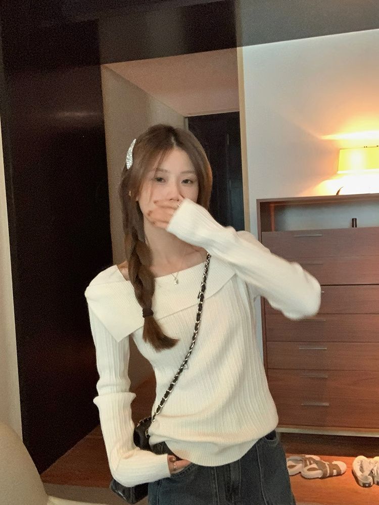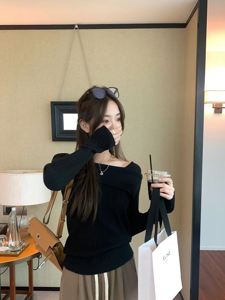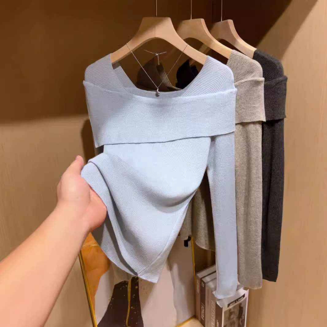 フランスの肩の斜めの肩の肩の長袖のニットのセーターの女性の秋の独特なデザイン感の中で底のシャツの上着を掛けます。