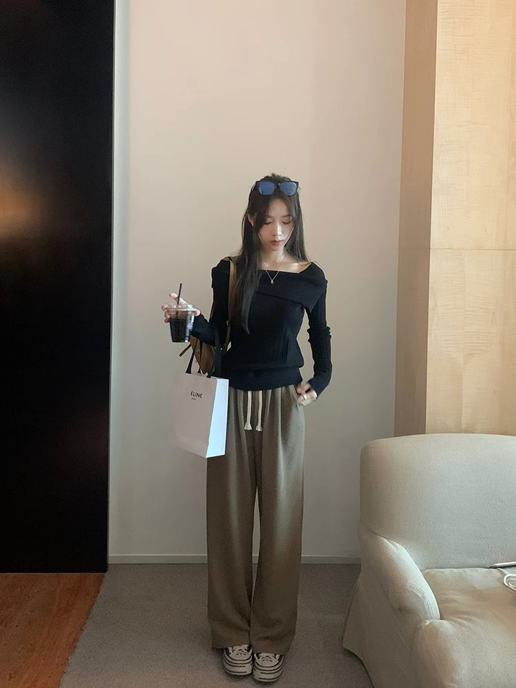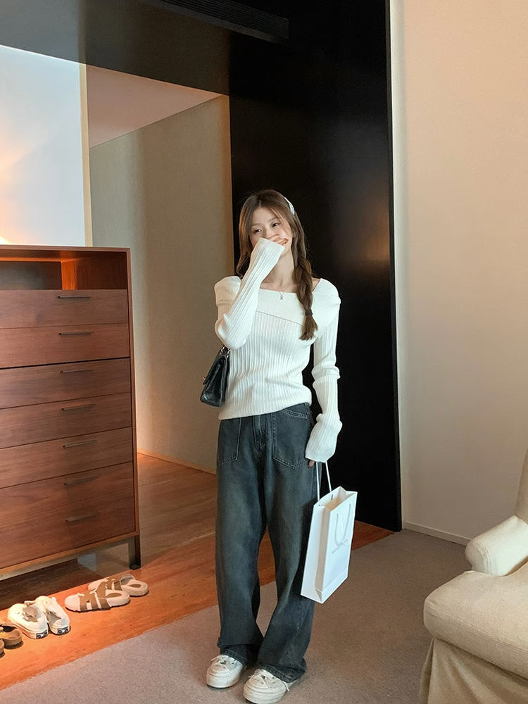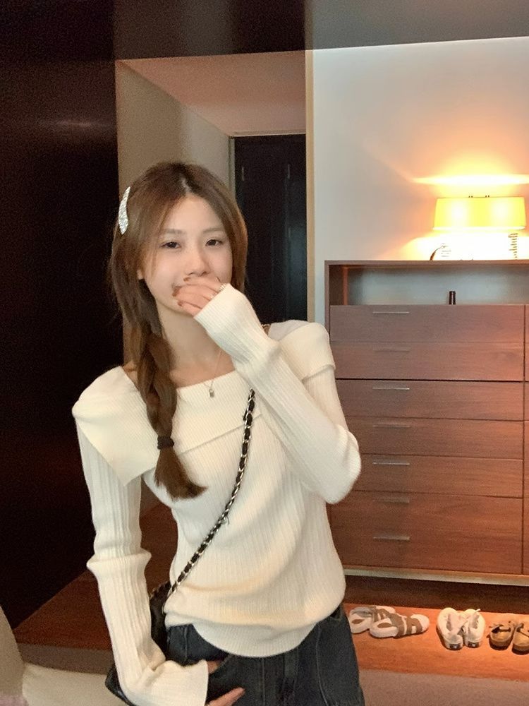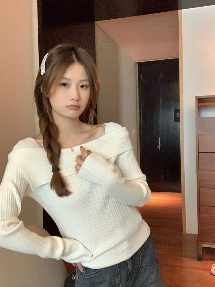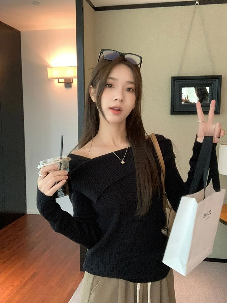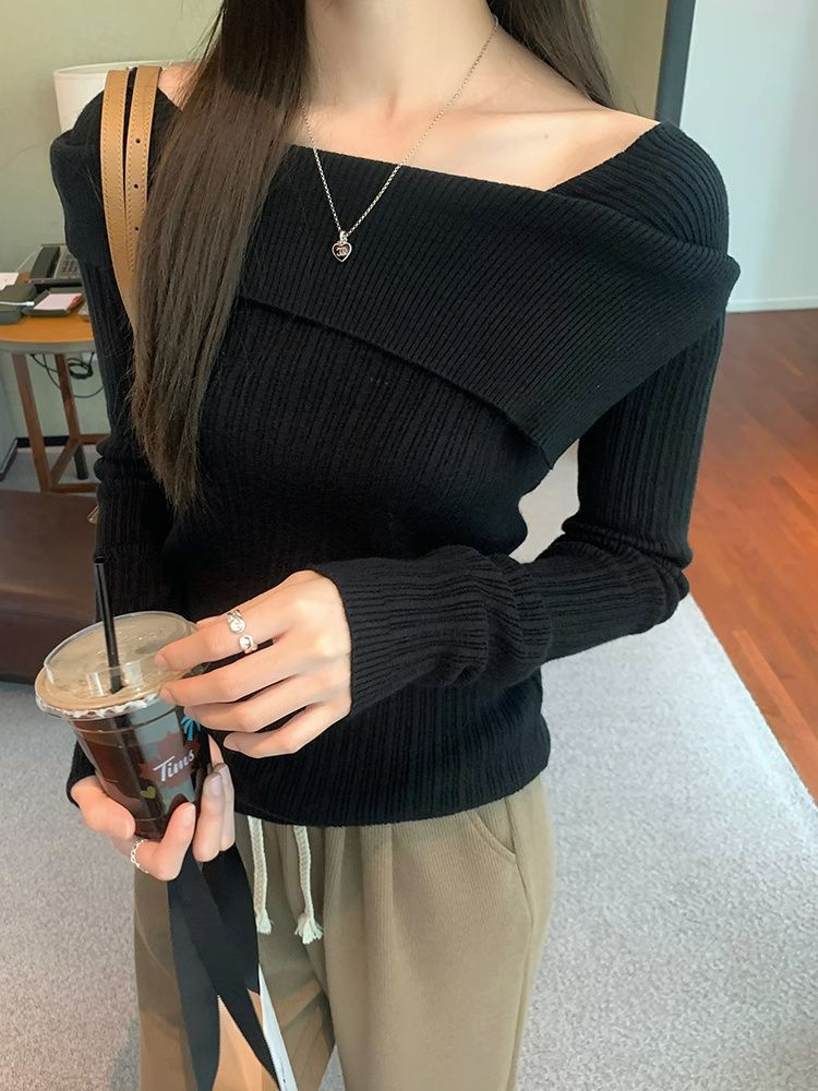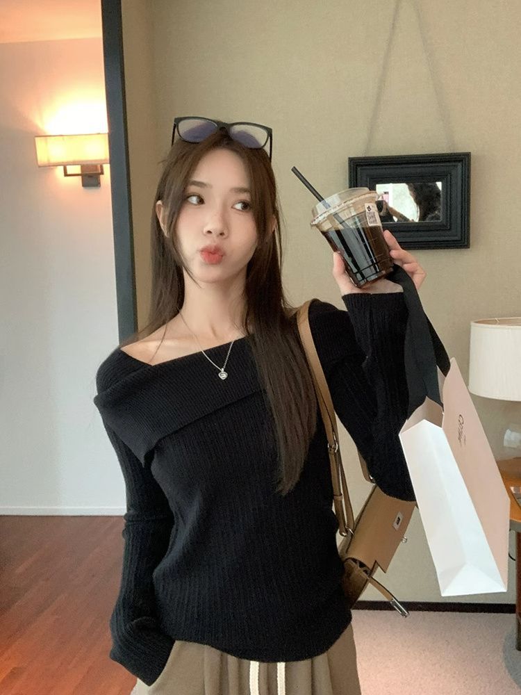 フランスの肩の斜めの肩の肩の長袖のニットのセーターの女性の秋の独特なデザイン感の中で底のシャツの上着を掛けます。