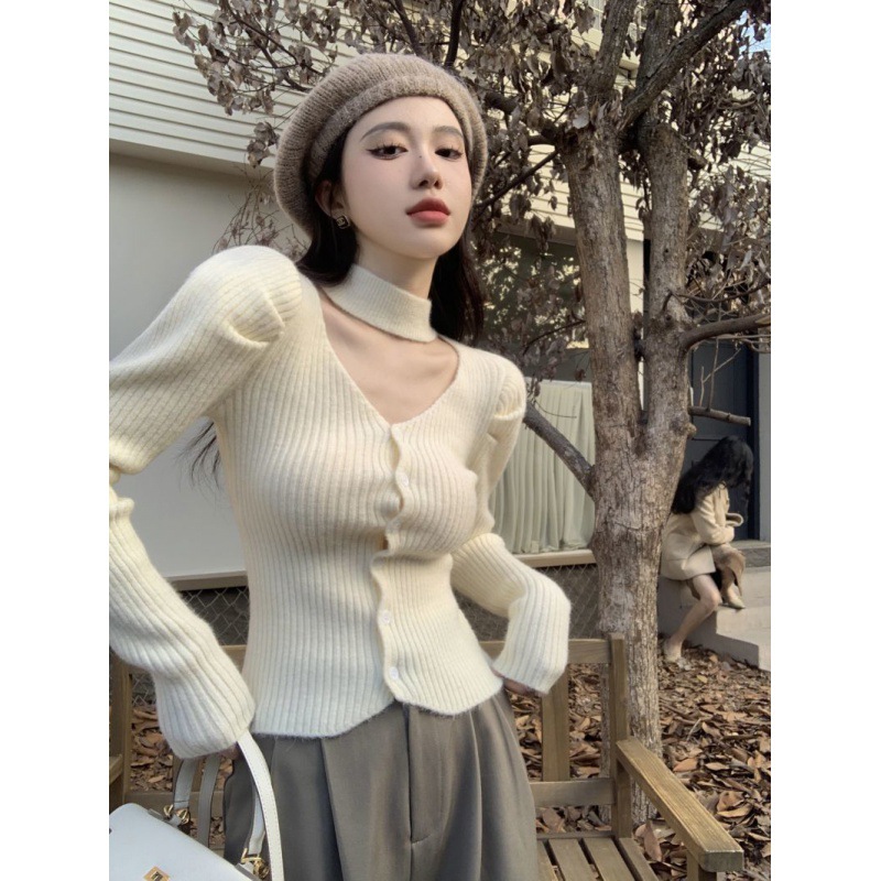 Vネックの不規則なオープンフォークのニットの底のシャツの女性の初秋の2023長袖の中にセーターを掛けて短い上着を修理します。
