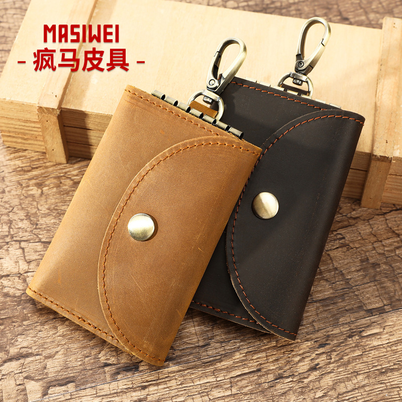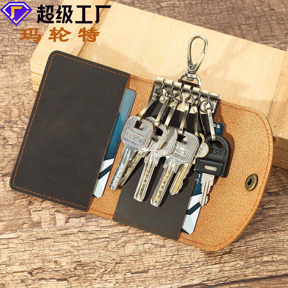 外贸复古疯马皮钥匙包高档手拿零钱包男头层牛皮腰间钥匙挂包批发