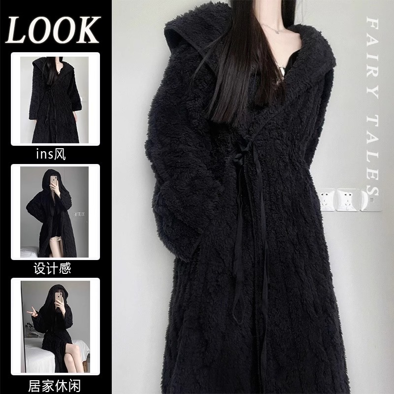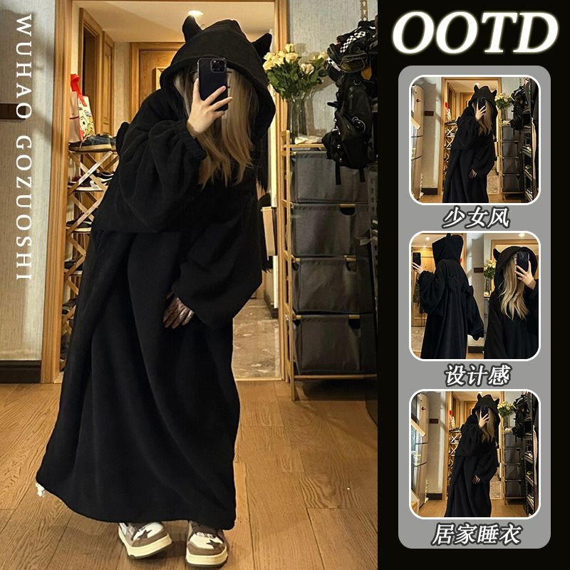コーラルベルベットのロングタイプの帽子付き黒のパジャマ女性秋冬の新しい高級感は、女性の長袖のホームウェアを着ることができます