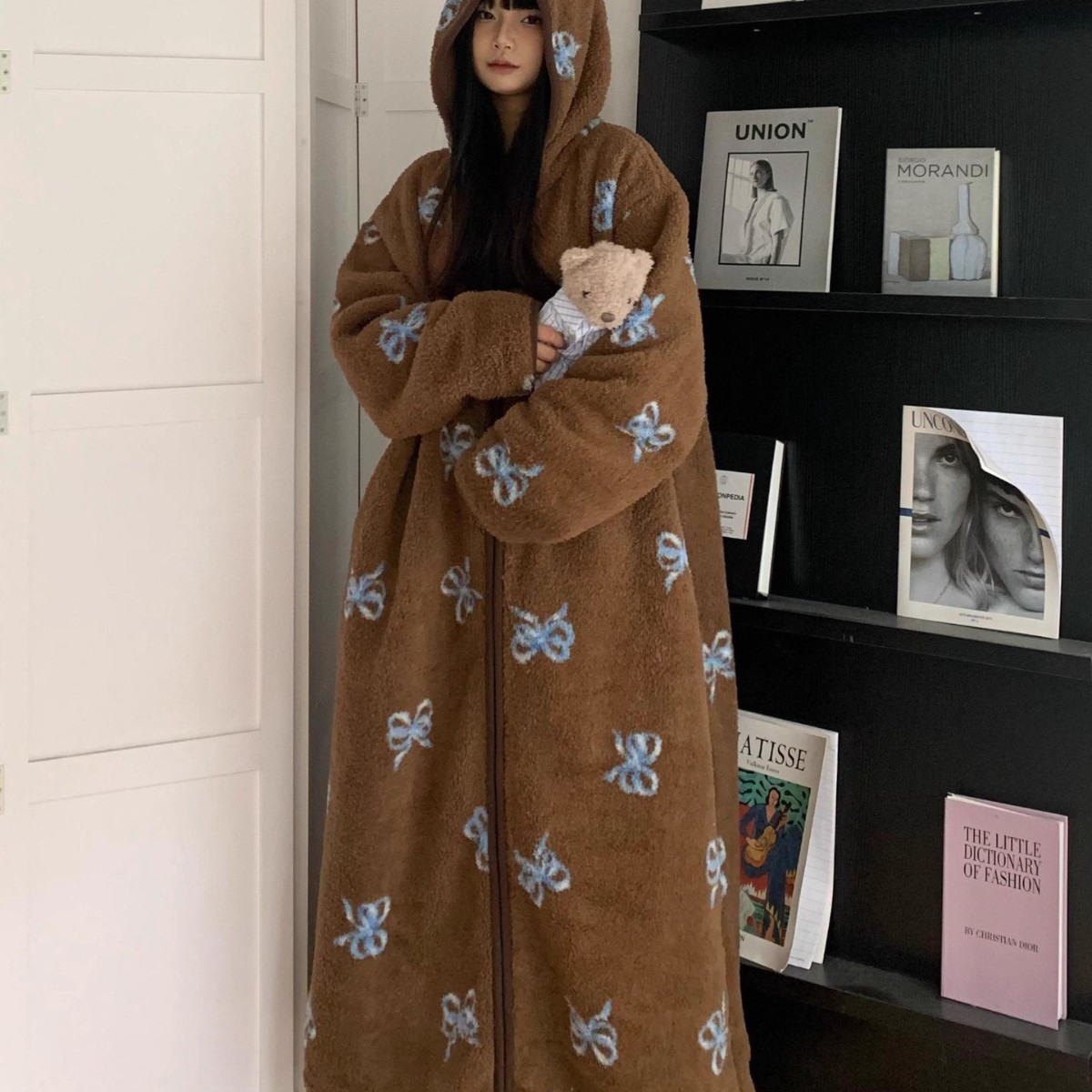 珊瑚绒连帽睡袍女款秋冬季加绒加厚甜美蝴蝶结大码长款睡裙家居服