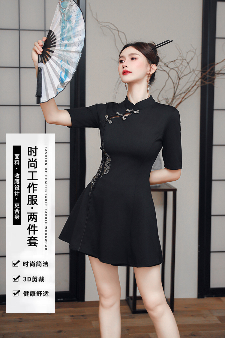 新型チャイナドレスの新中国式改良黒足浴技師の作業服の気質はやせています。