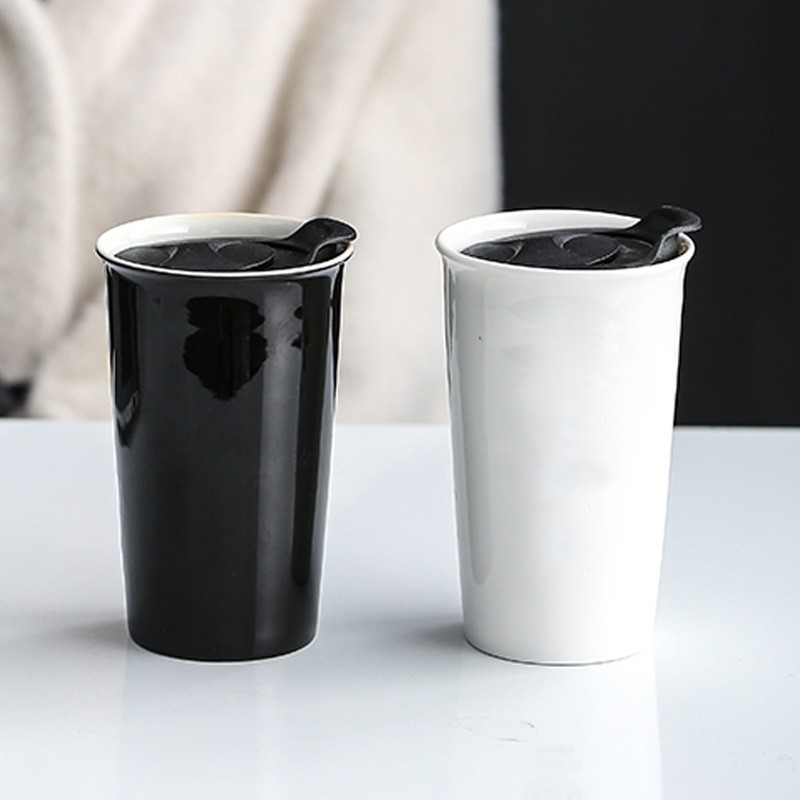 简约时尚大双层隔热推盖陶瓷马克杯办公室水杯商务礼品杯可印logo