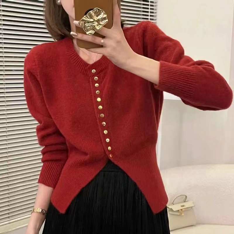 重複しないデザイン〜2026秋冬シングルボタンニットカーディガンレディース、デザイン性のある薄手のローラウンドネックアウタートップス、海外販売