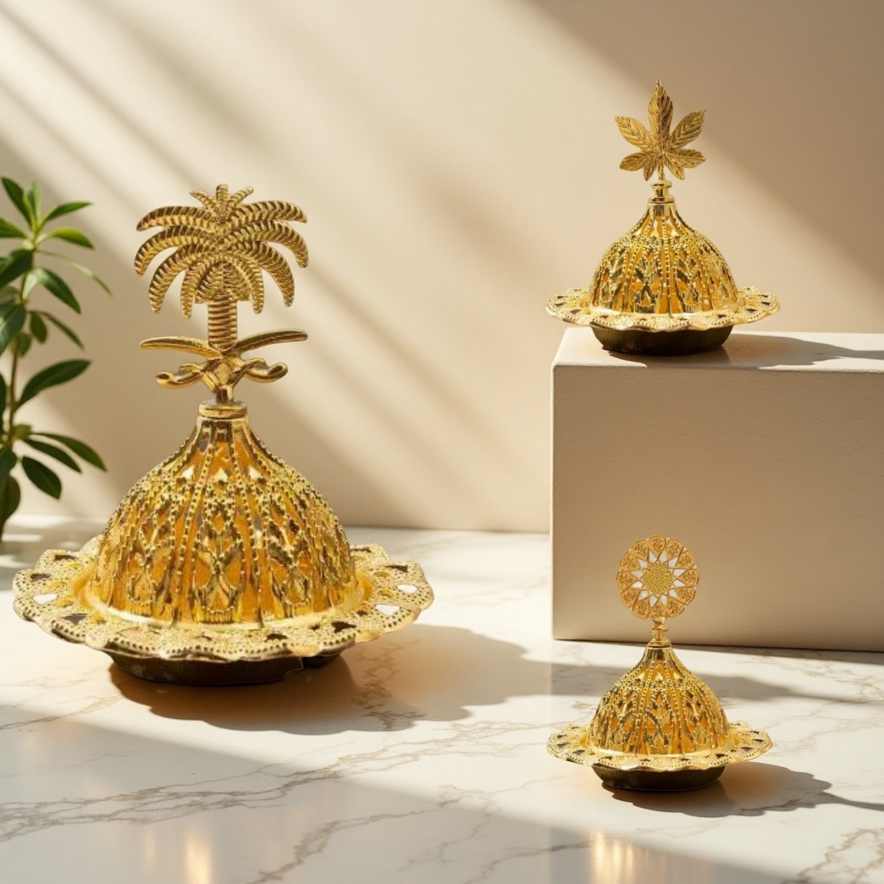創意的な金色の豪華な透かし彫りの樹脂の香炉中東のアラビアの精巧なシリカゲルアロマストーブはゴムの香炉を並べます。
