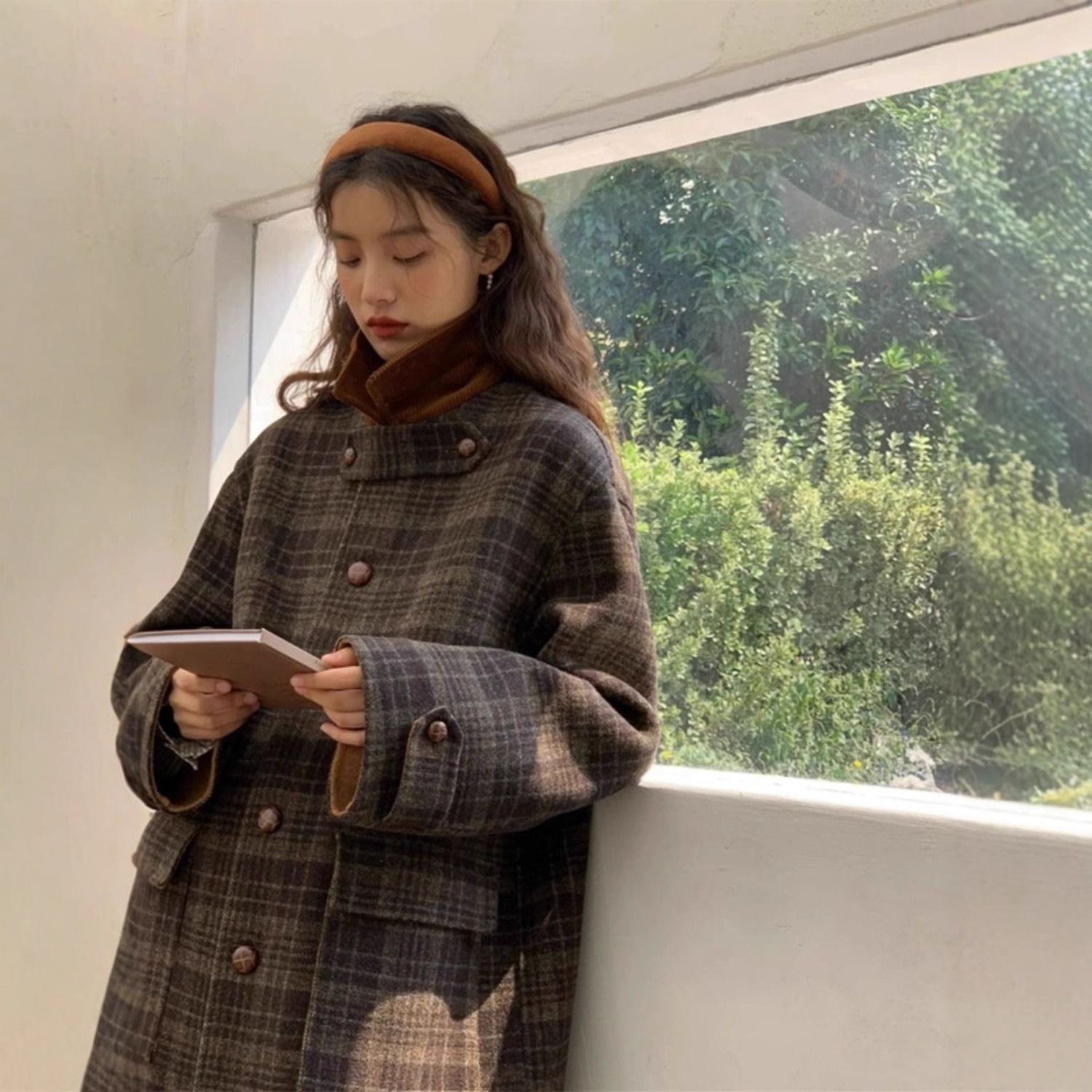 冬のレトロなウールのコントラストのあるチェック柄のワイドフロントのフード付きロングコート2025秋冬通勤用ジャケット