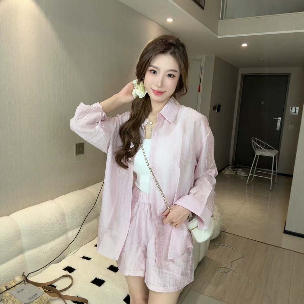 2025年夏用レディース薄手長袖通気性日焼け止めツーピースセット、シャツとショートパンツ、ボタン付きストライプ、通勤用