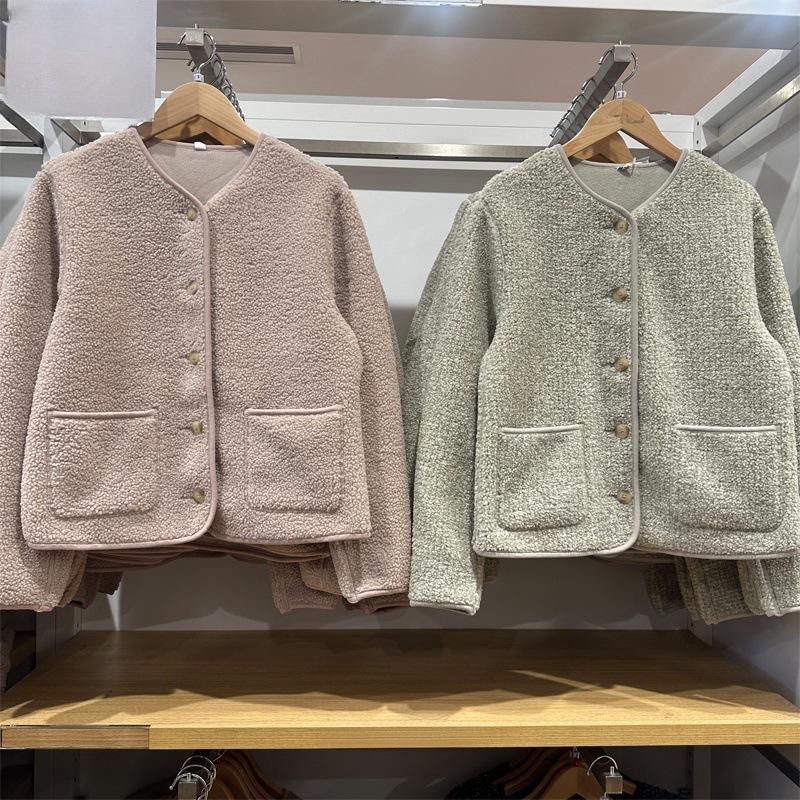 日単 ~ 2023秋冬の新型の柔らかい羊の小毛のvネックのファスナーの保温のフリースの短いコートの女性