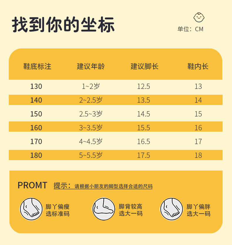 サイズ 【130】靴の中の長さ13CMは足の長さ12.5CMを提案します。,【140】靴の中の長さ14CMは足の長さ13.5CMを提案します。,【150】靴の中の長さ15CMは足の長さ14.5CMを提案します。,【160】靴の中の長さ16CMは足の長さ15 CMを提案します。,【170】靴の中の長さ17CMは足の長さ16 CMを提案します。,【180】靴の中の長さ18CMは足の長さ17.5CMを提案します。