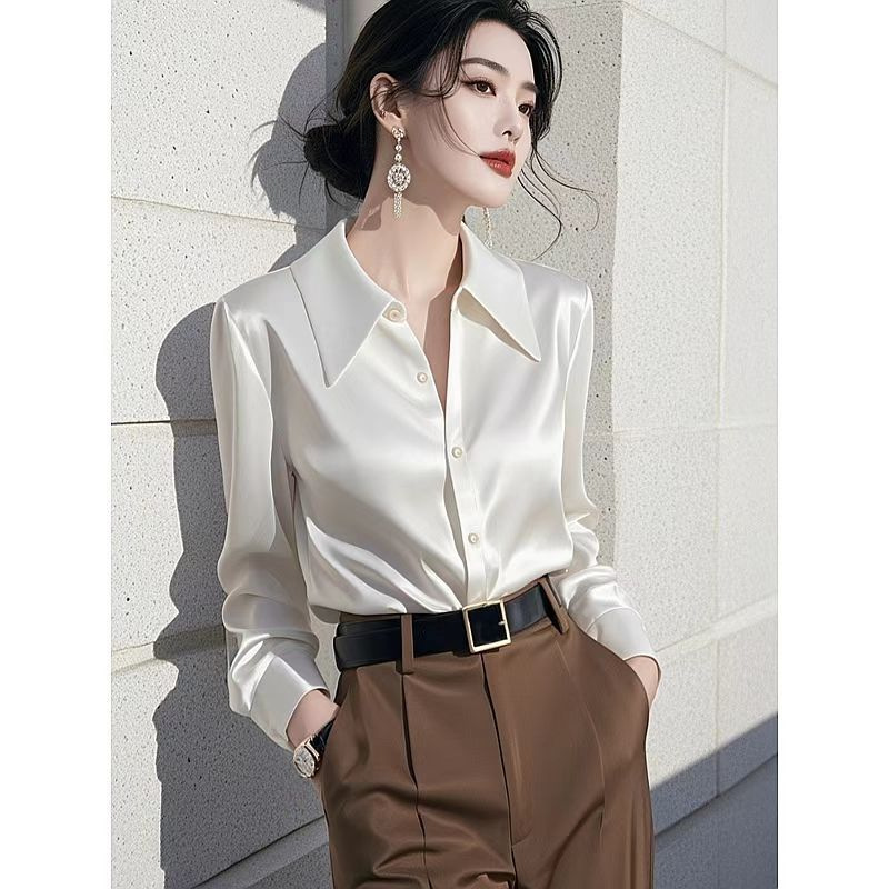 アセテートシルクサテン白シャツ レディース 2025春秋冬新作 デザイン性のある個性的なインナーウェア フレンチスタイルトップス