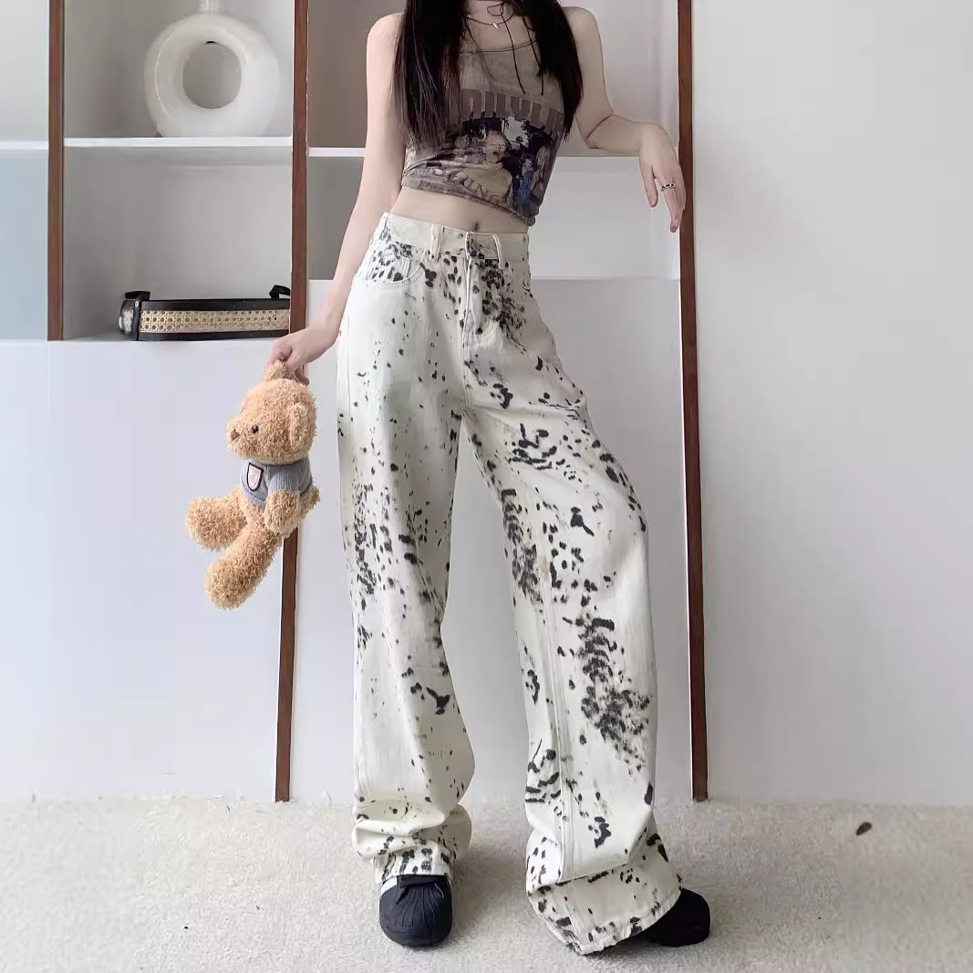 レトロなレオパード柄ワイドレッグジーンズ 2026年春秋 ハイストリートスタイル ハイウエスト ルーズストレート カジュアルで万能 着痩せ効果あり