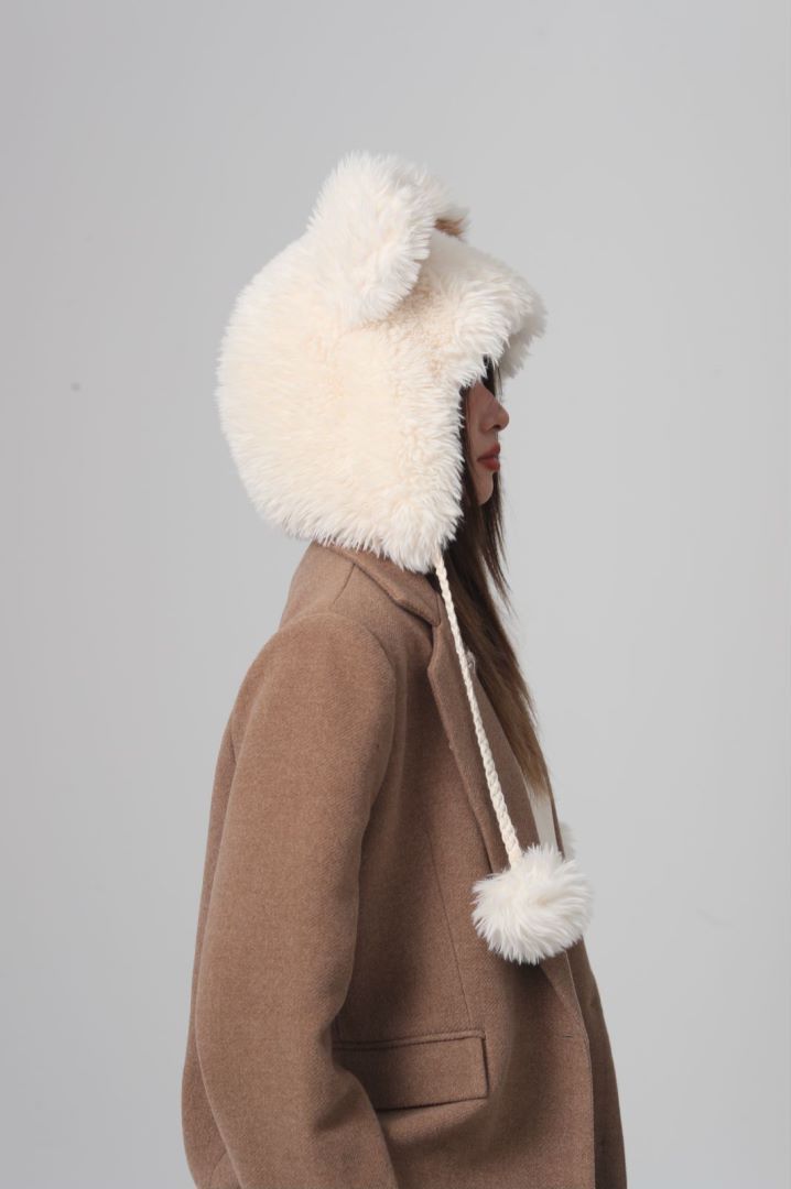 秋冬のバケツの帽子の女性の白いウサギの毛は顔を隠します。