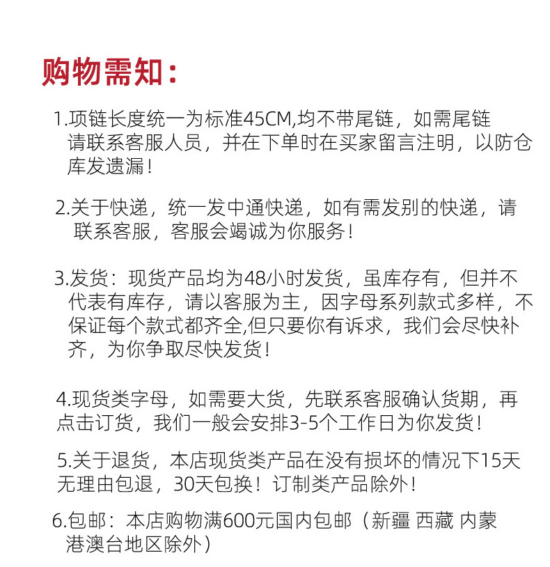 | 一、放假时间 尊敬的新老用户,春节将至,为不耽误您春节使用,建议您尽早下单!本店新年假期放假时间为2026年2月10日-2026年2月26日 二、关于发货 因客服回家过年,故春节期间只接单不发货,所有的产品将在春节结束后,2月26日按时间先后顺序陆续安排发货,在此期间有任何问题请留言,节后我们会给您处理,给您带来的不便敬请谅解。 | ||||||||||||