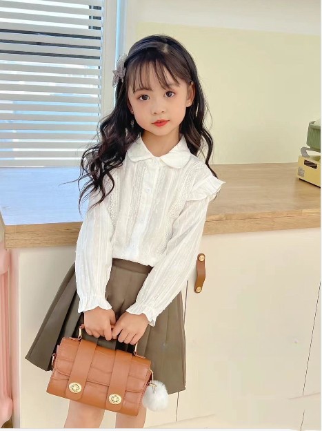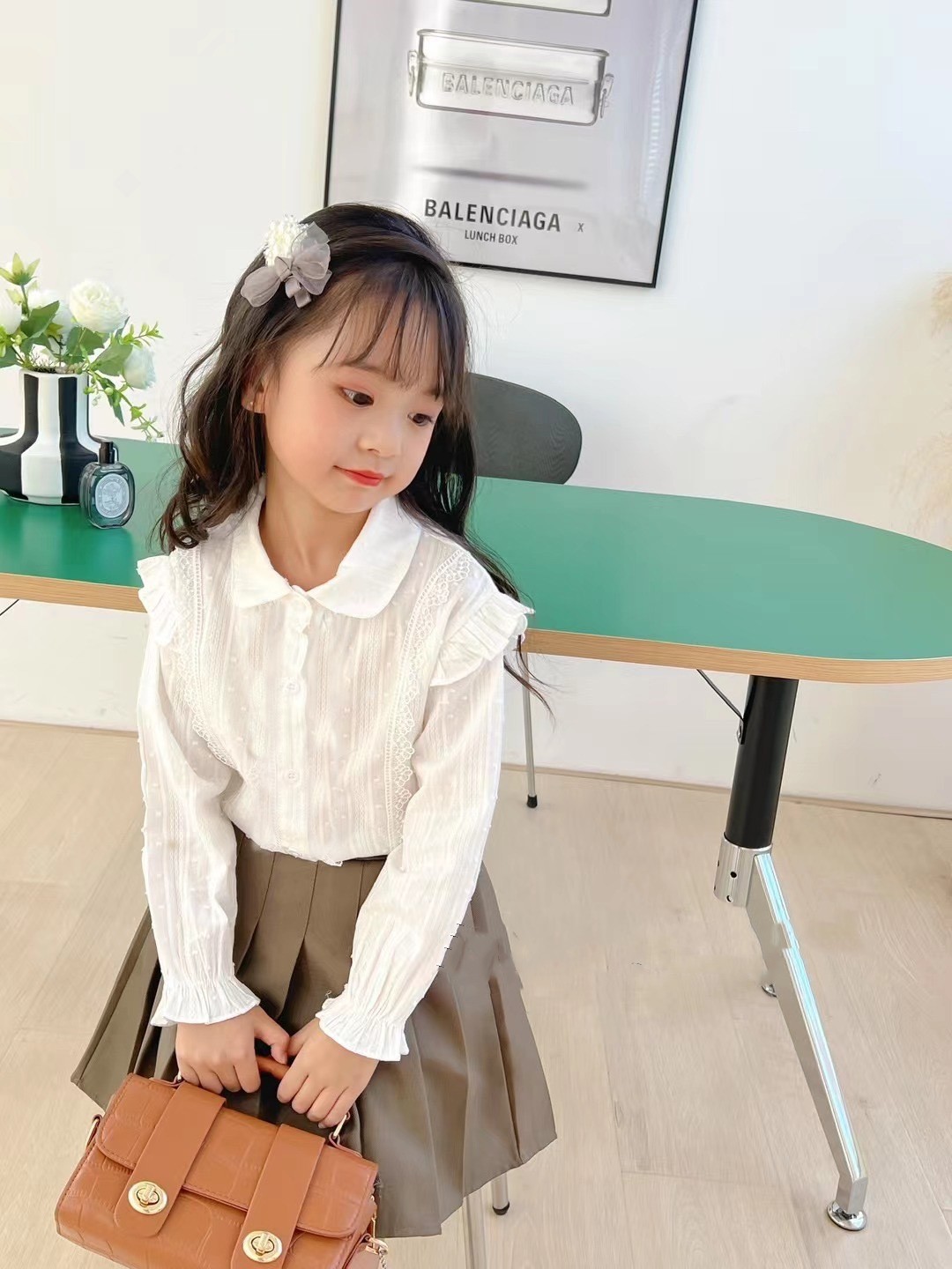 春装2024春タイプの子供用シャツの女の子のフランスの花の縁の襟の白いシャツの女性の宝のデザイン感の長袖のシャツ