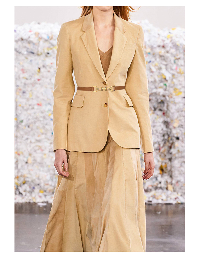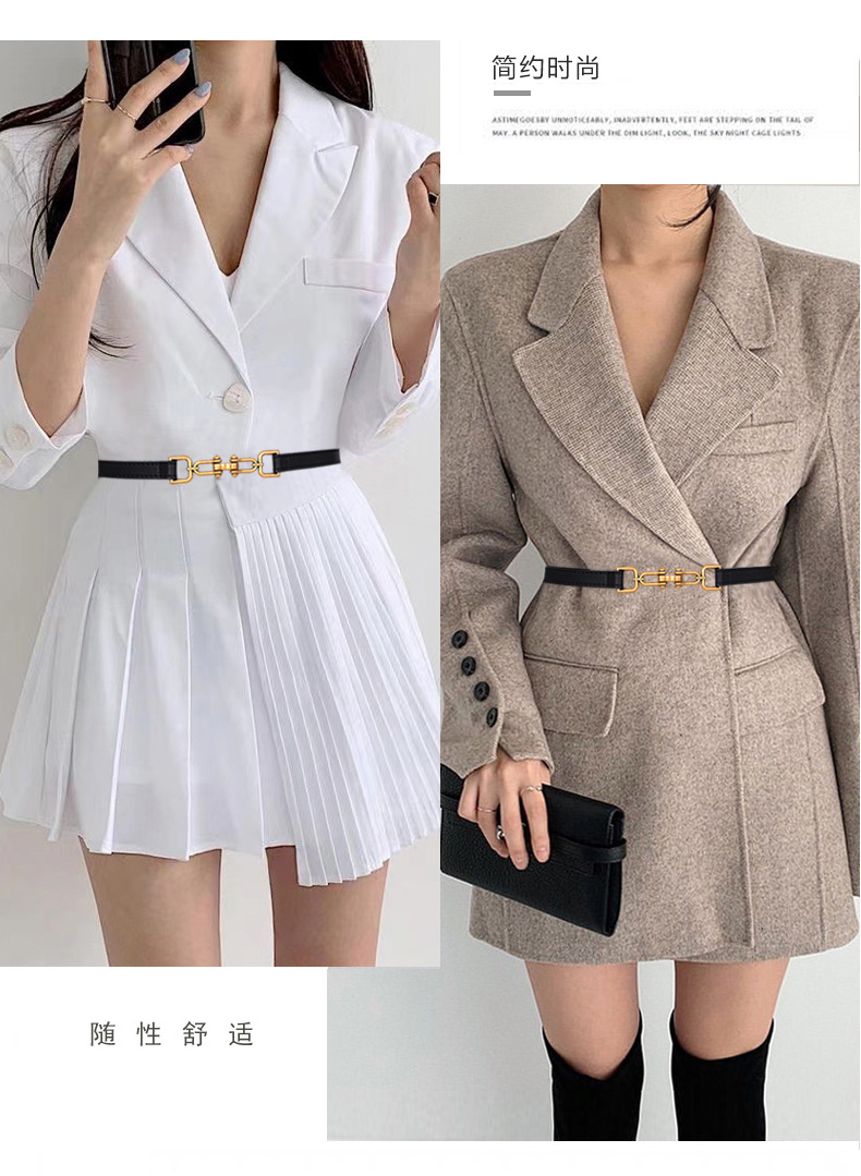 本革のベルトの女性はスーツのワンピースを飾ります。