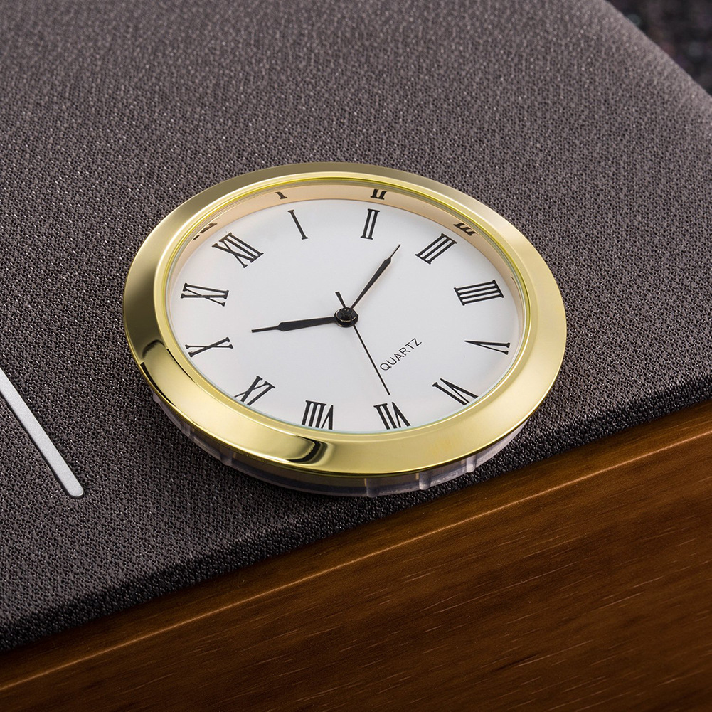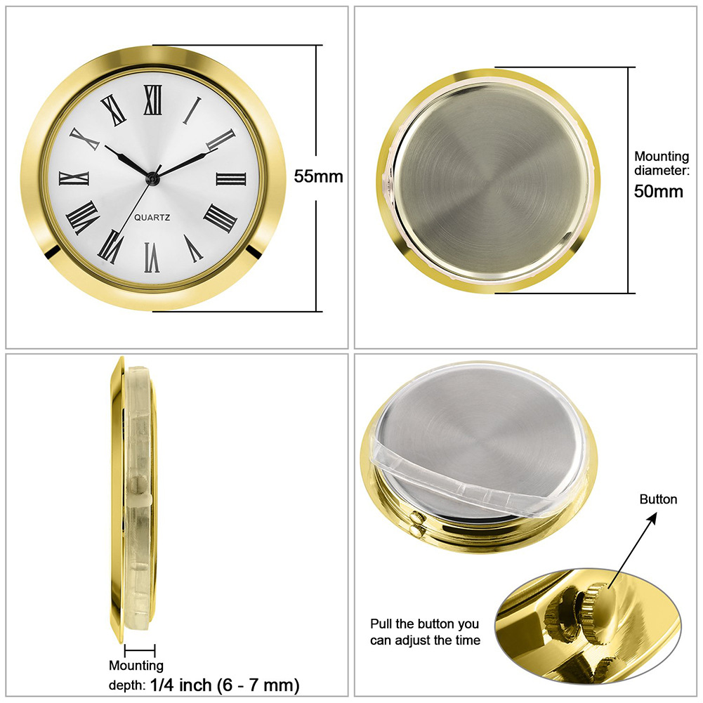 金色边框,白色表盘上的罗马字,透明玻璃镜片,采用日本进口PC21机芯,内置电池,配有一个橡胶圈,有助于将插入物固定到位,安装简单,适合玻璃、水晶工艺钟
