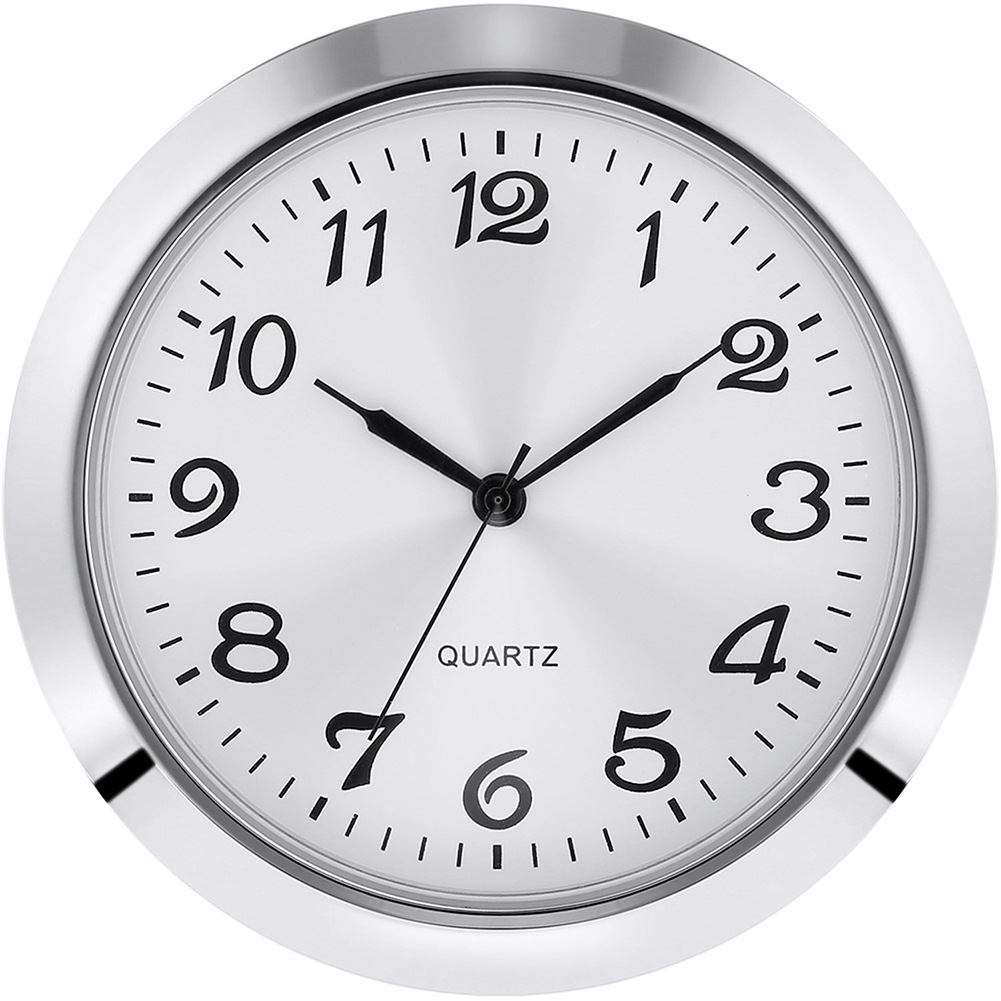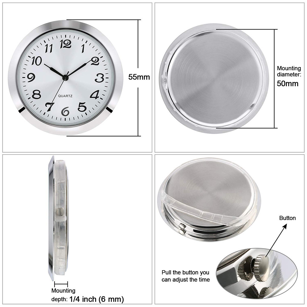 银色边框,白色表盘上的阿拉伯数字,透明玻璃镜片,采用日本进口PC21机芯,内置电池,配有一个橡胶圈,有助于将插入物固定到位,安装简单,适合玻璃、水晶工艺钟