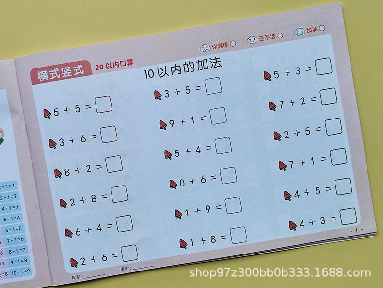 幼い子供が一日に言語ピンイン数学加減算練習帳を練習する前に加減算訓練を準備する