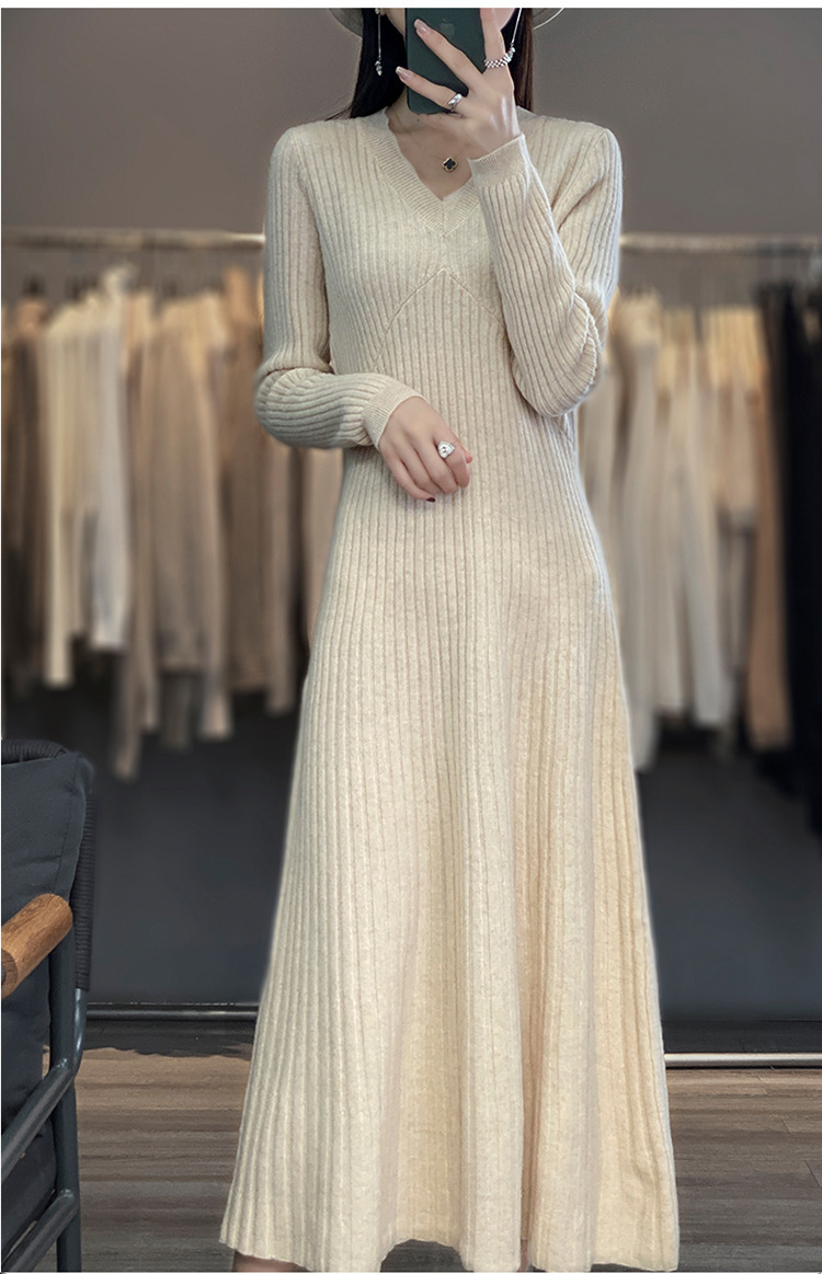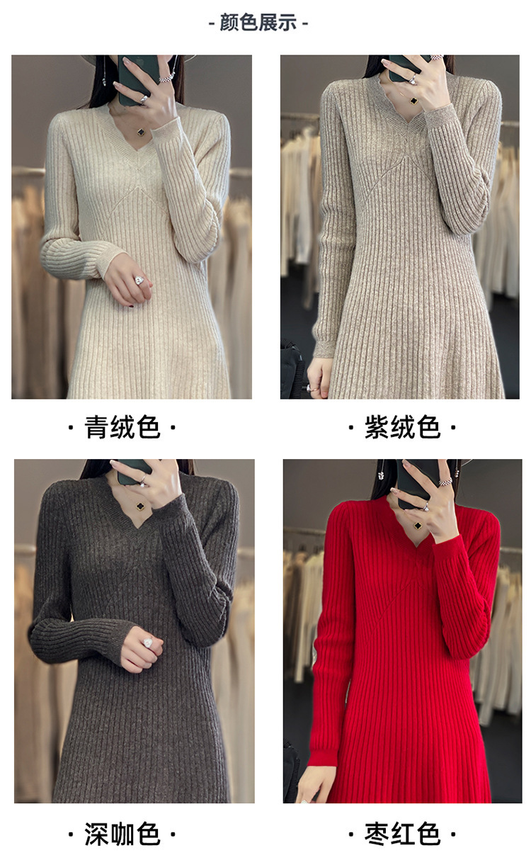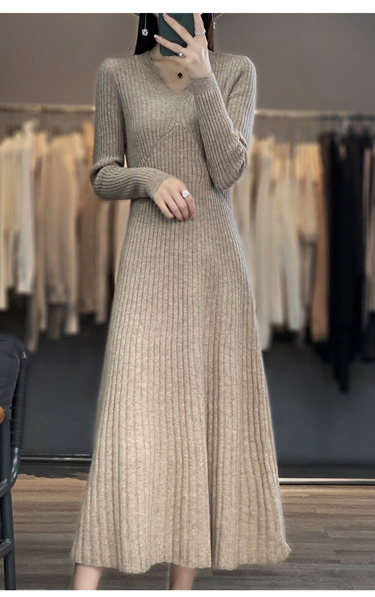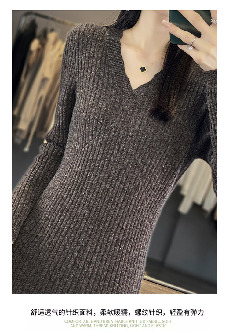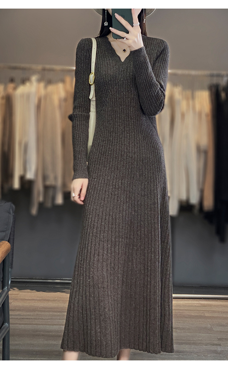 純ウール秋冬女性修身vネックの純色のロングワンピース