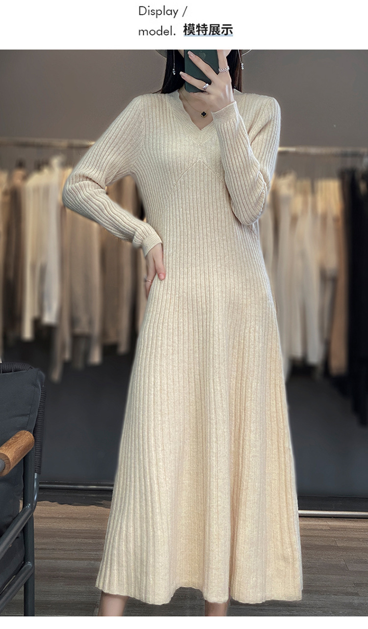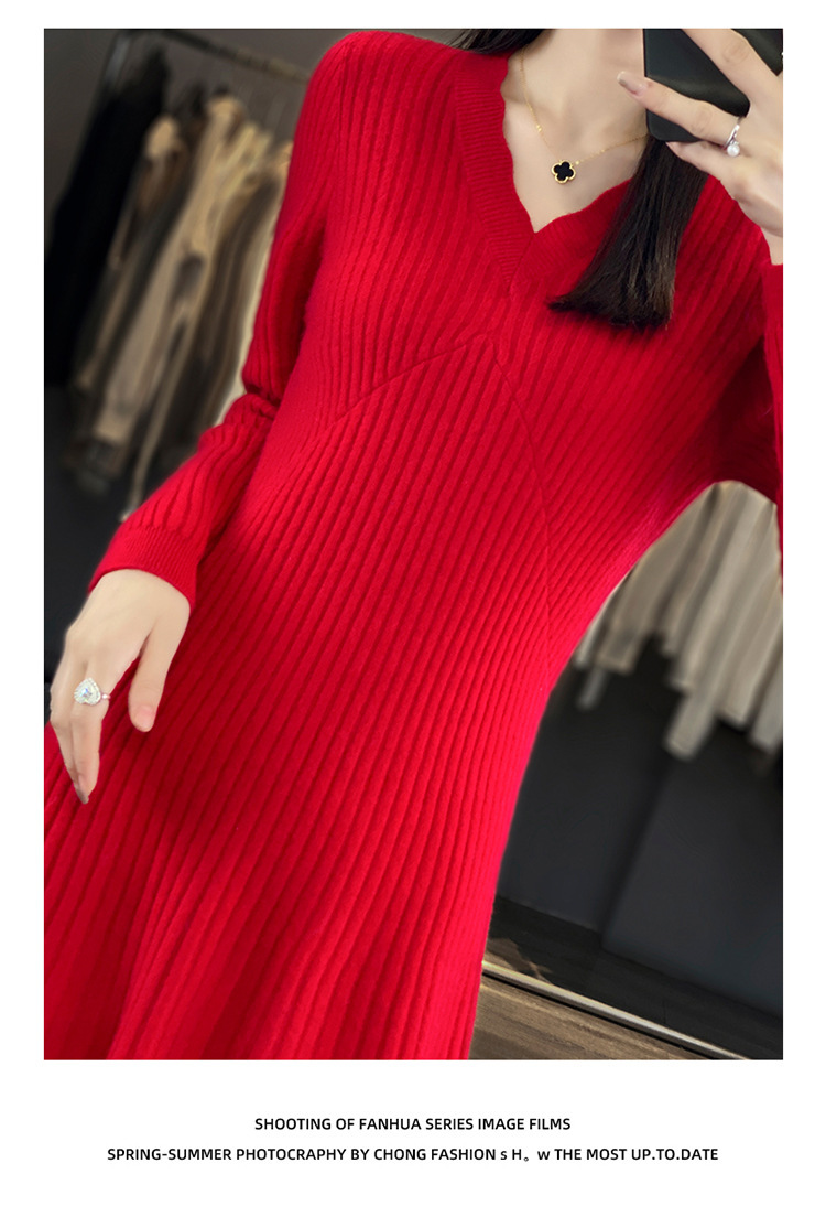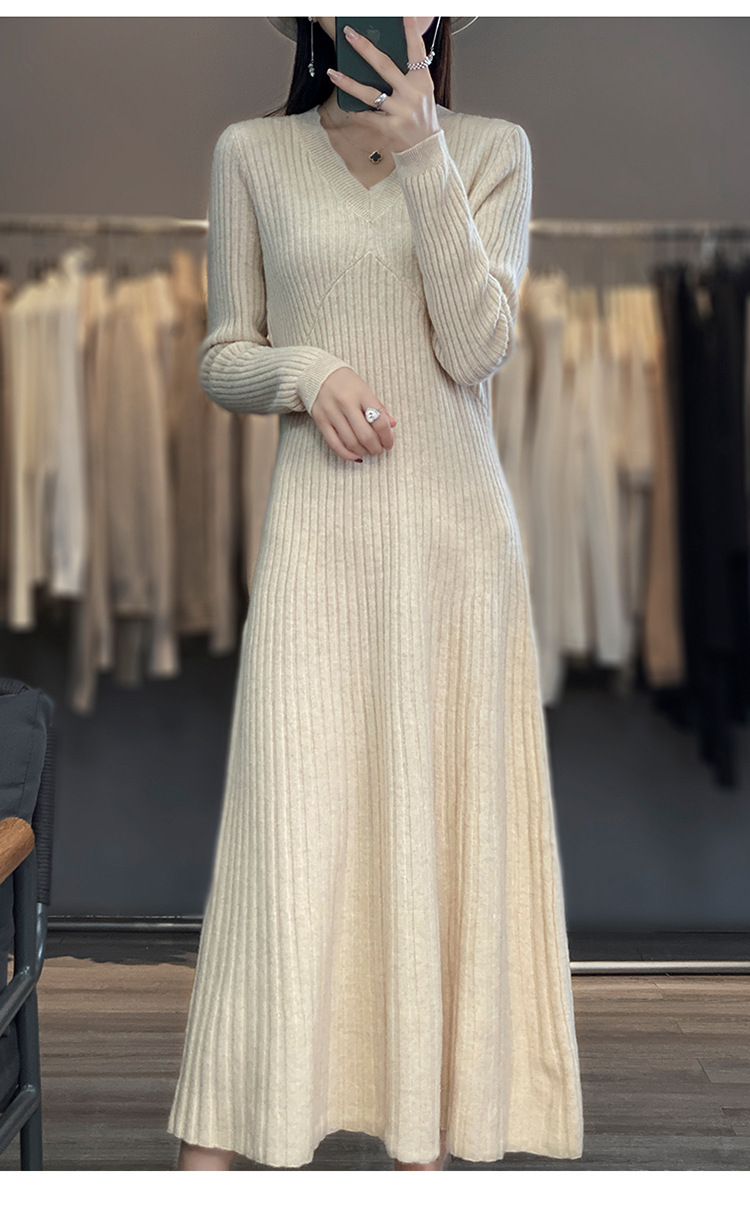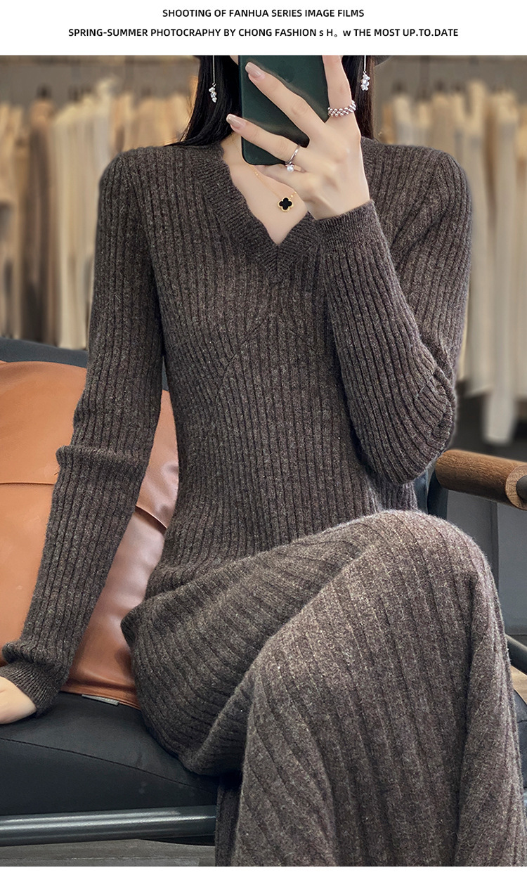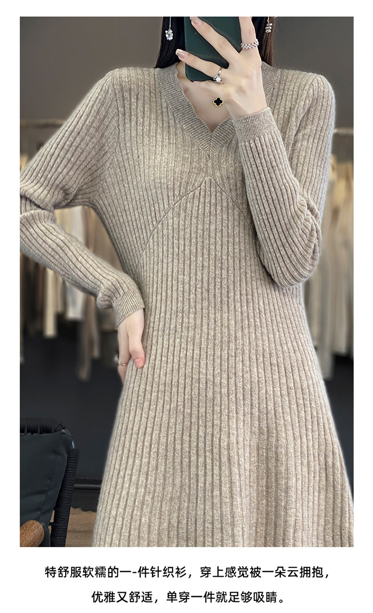 純ウール秋冬女性修身vネックの純色のロングワンピース