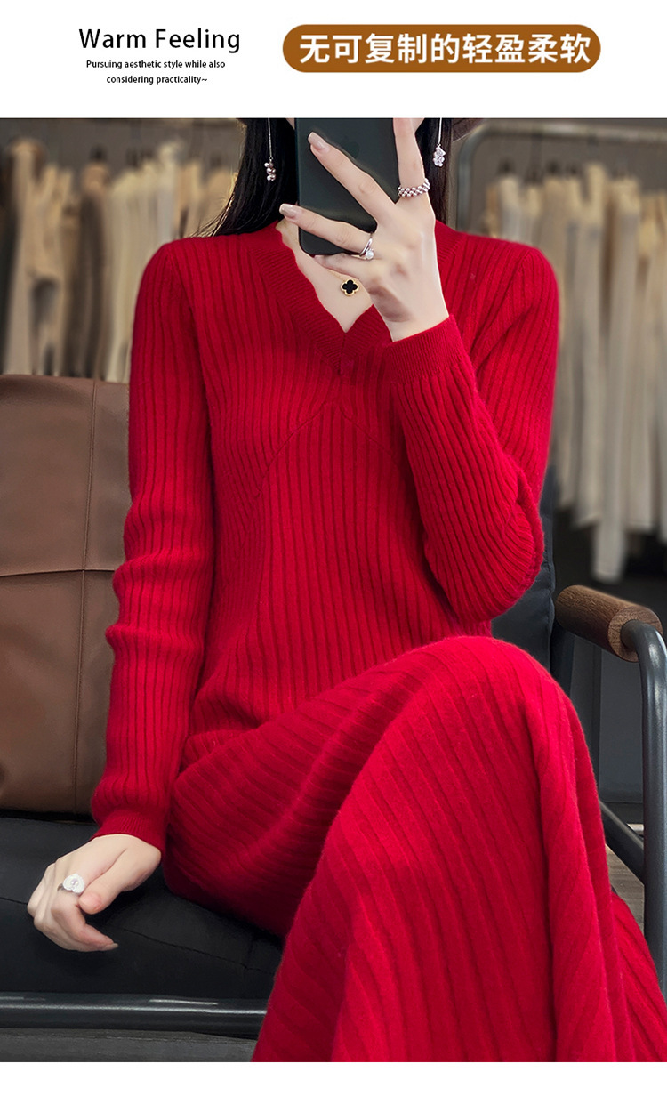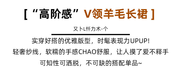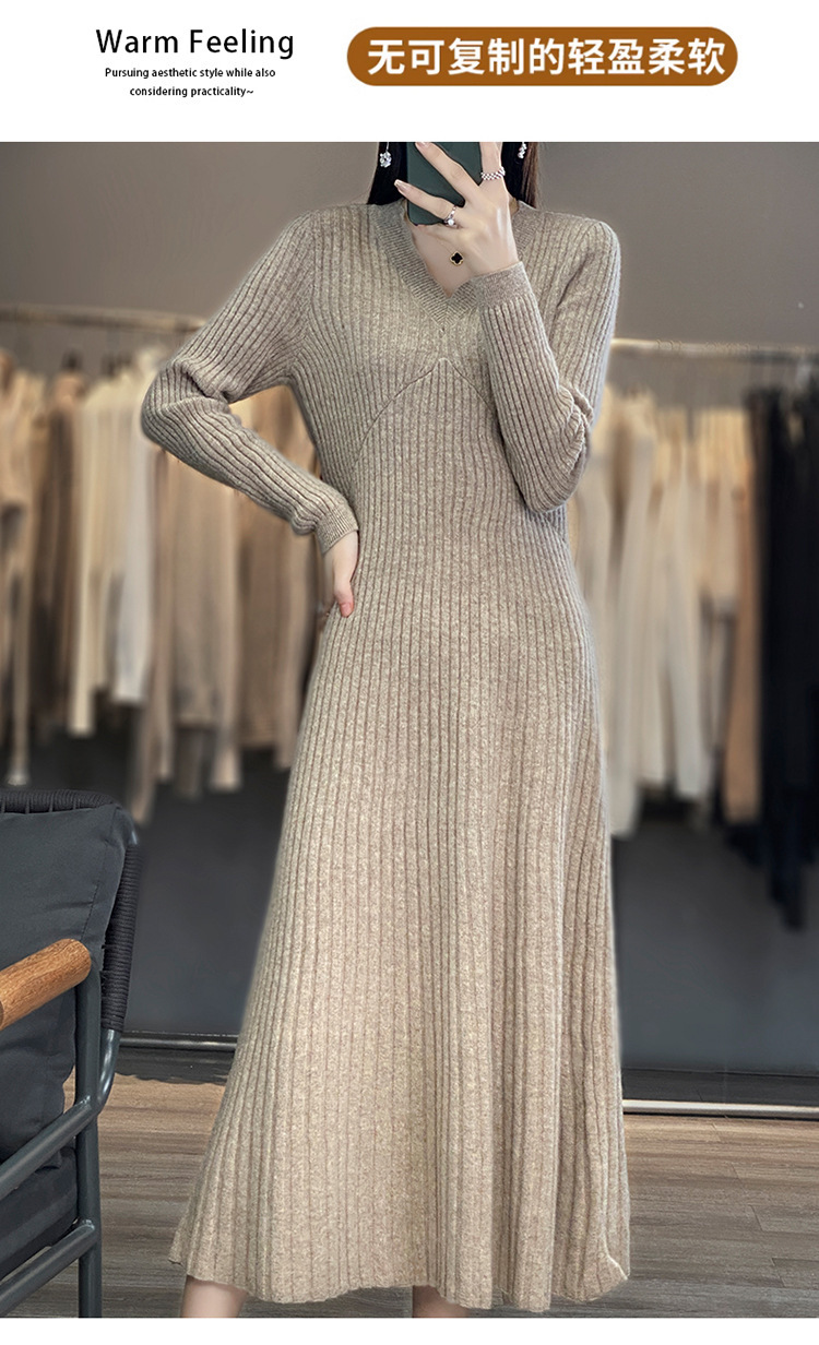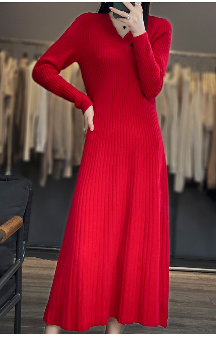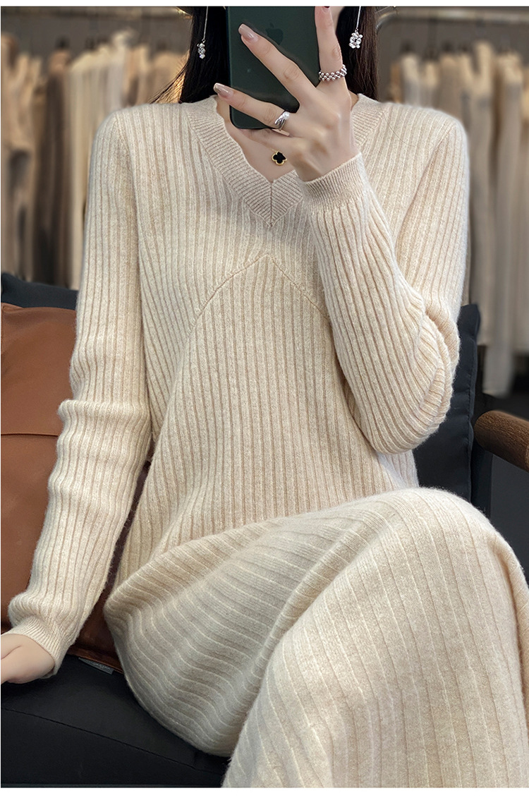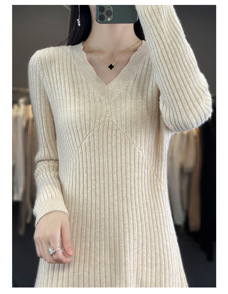 純ウール秋冬女性修身vネックの純色のロングワンピース