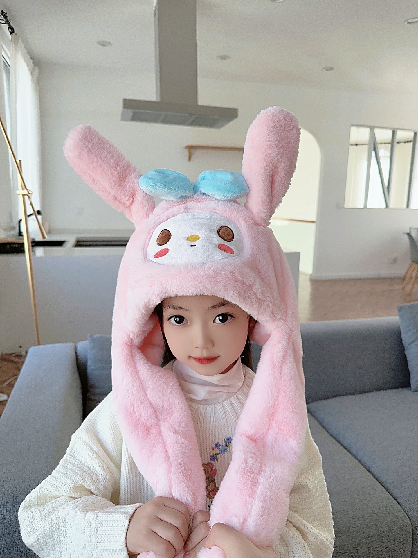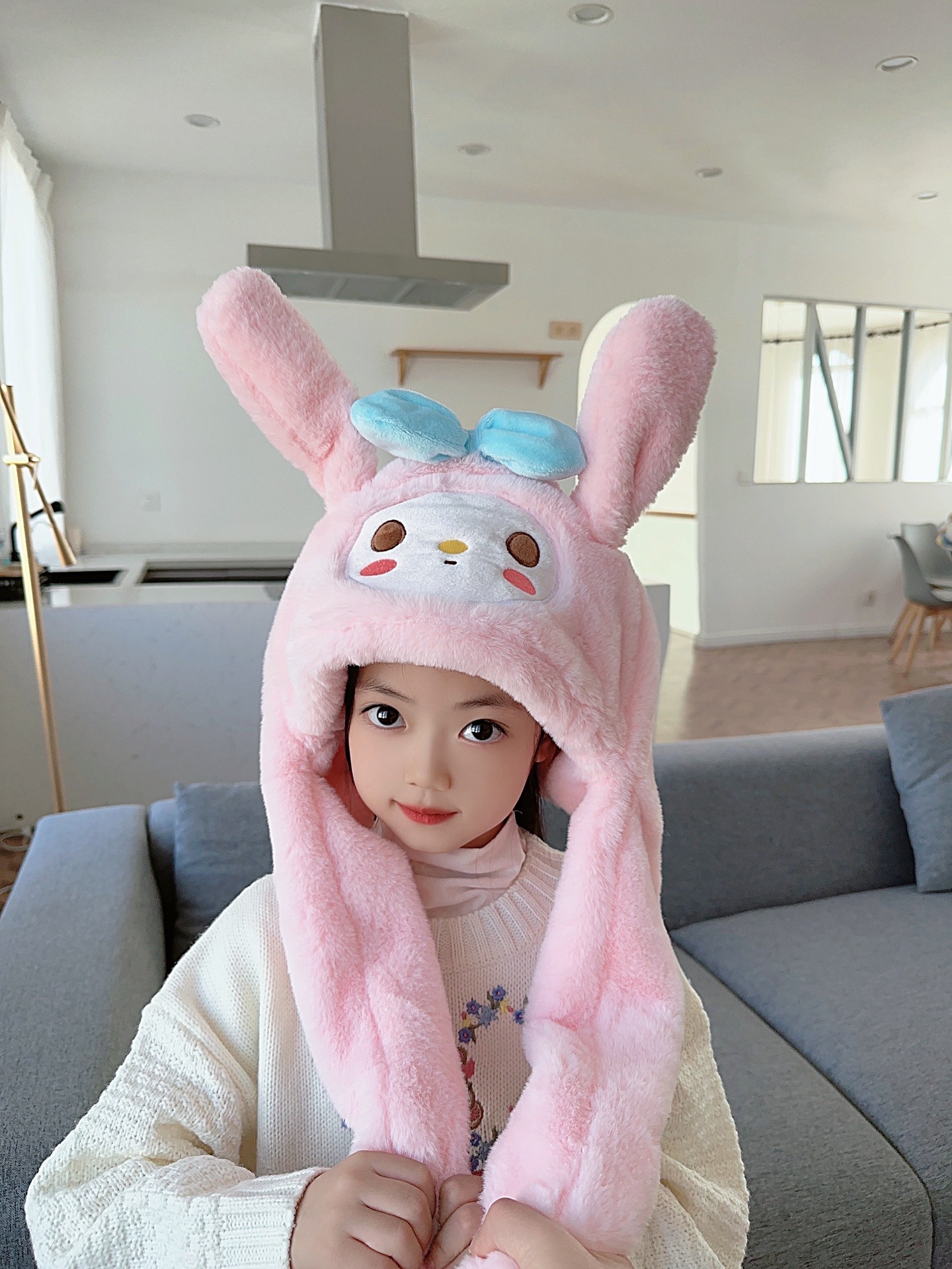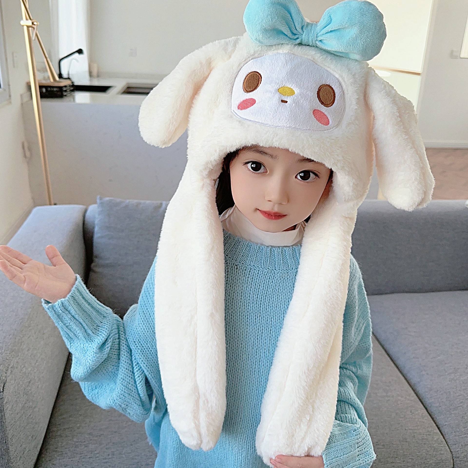 震え音の同じタイプのウサギの耳の帽子の子供の秋冬のネットの赤いかわいい耳をつまんで動く帽子のマフラーの一体体