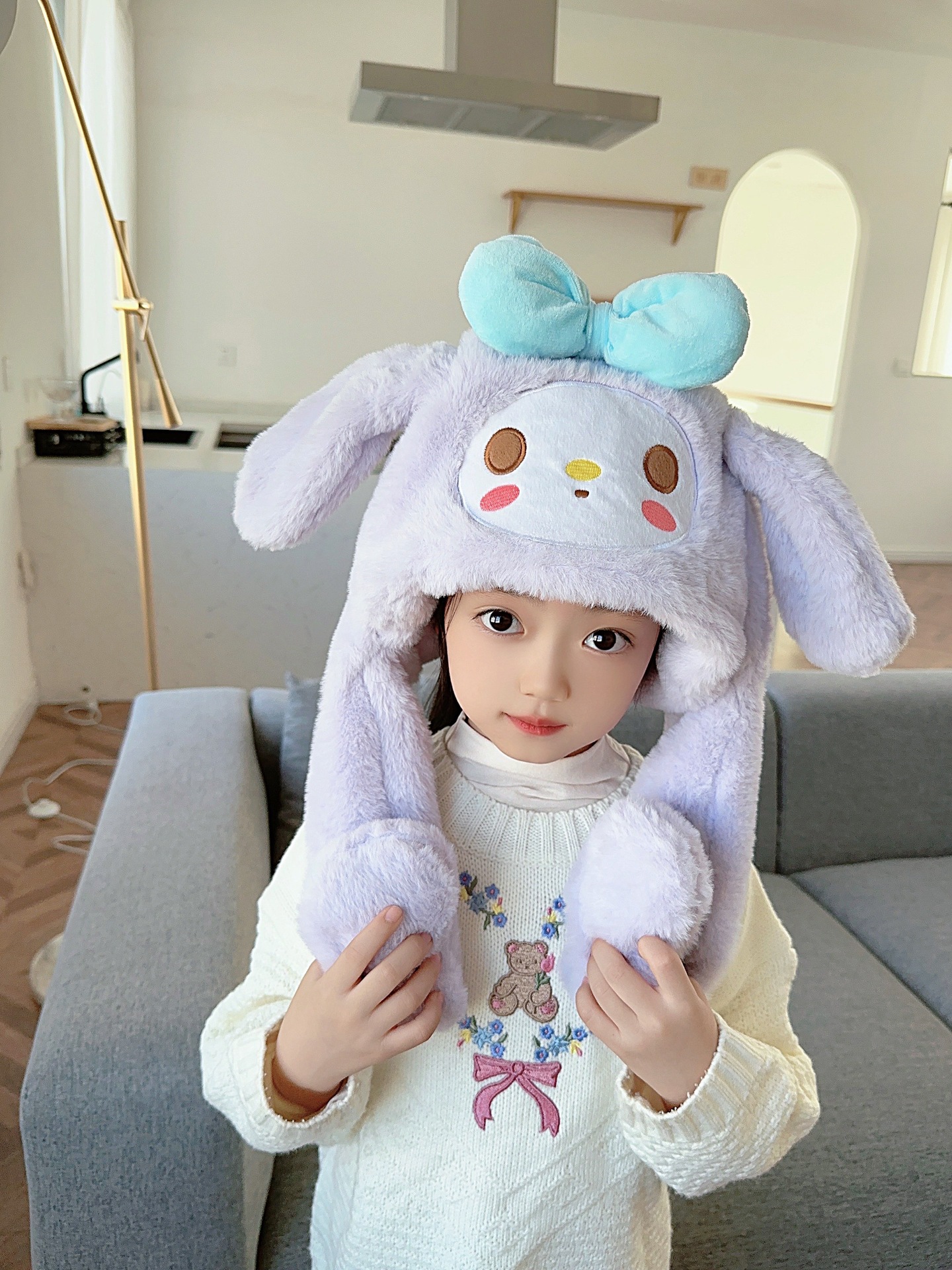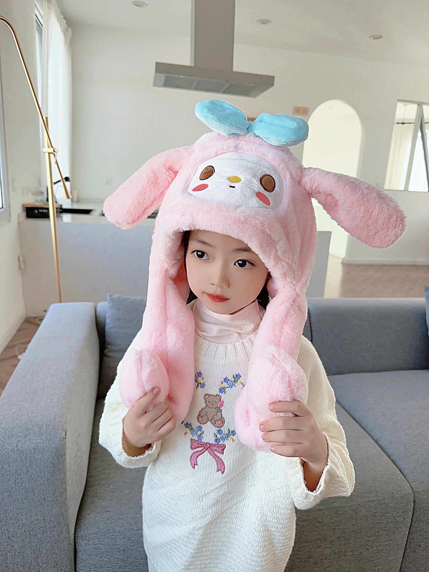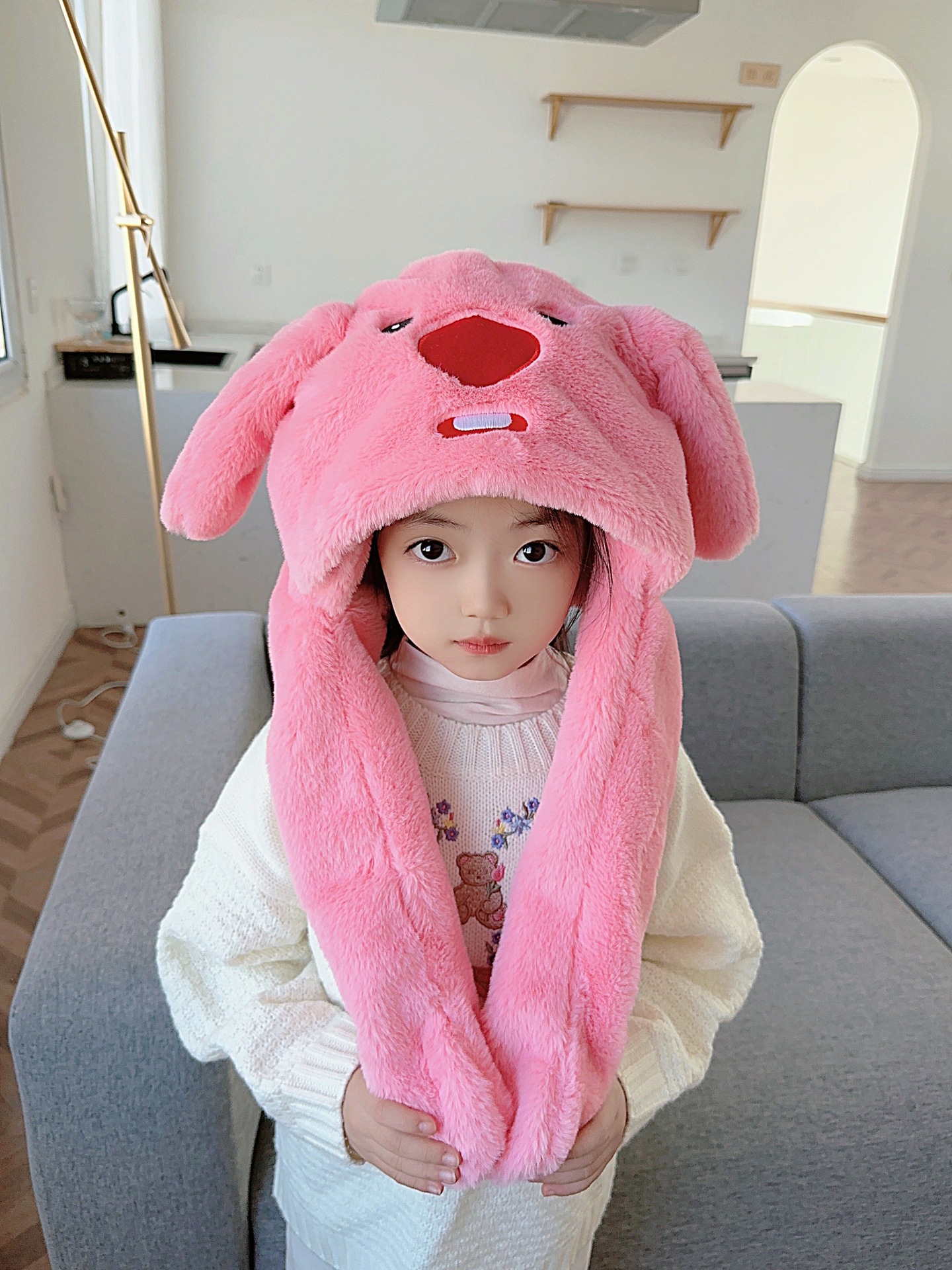 震え音の同じタイプのウサギの耳の帽子の子供の秋冬のネットの赤いかわいい耳をつまんで動く帽子のマフラーの一体体