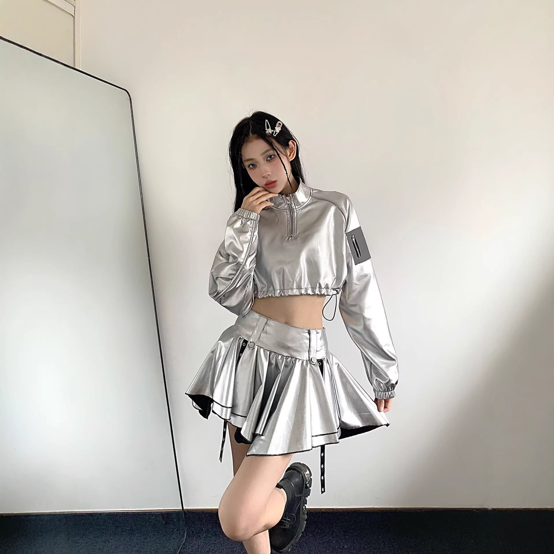 爵士舞女团银色科技感短款长袖卫衣外套高腰百褶半身裙跳舞演出服