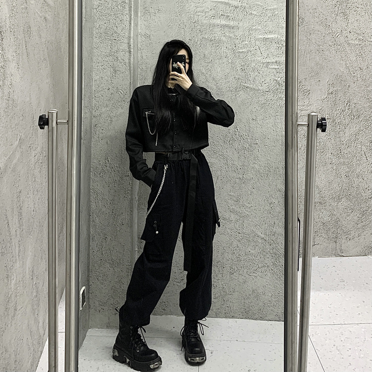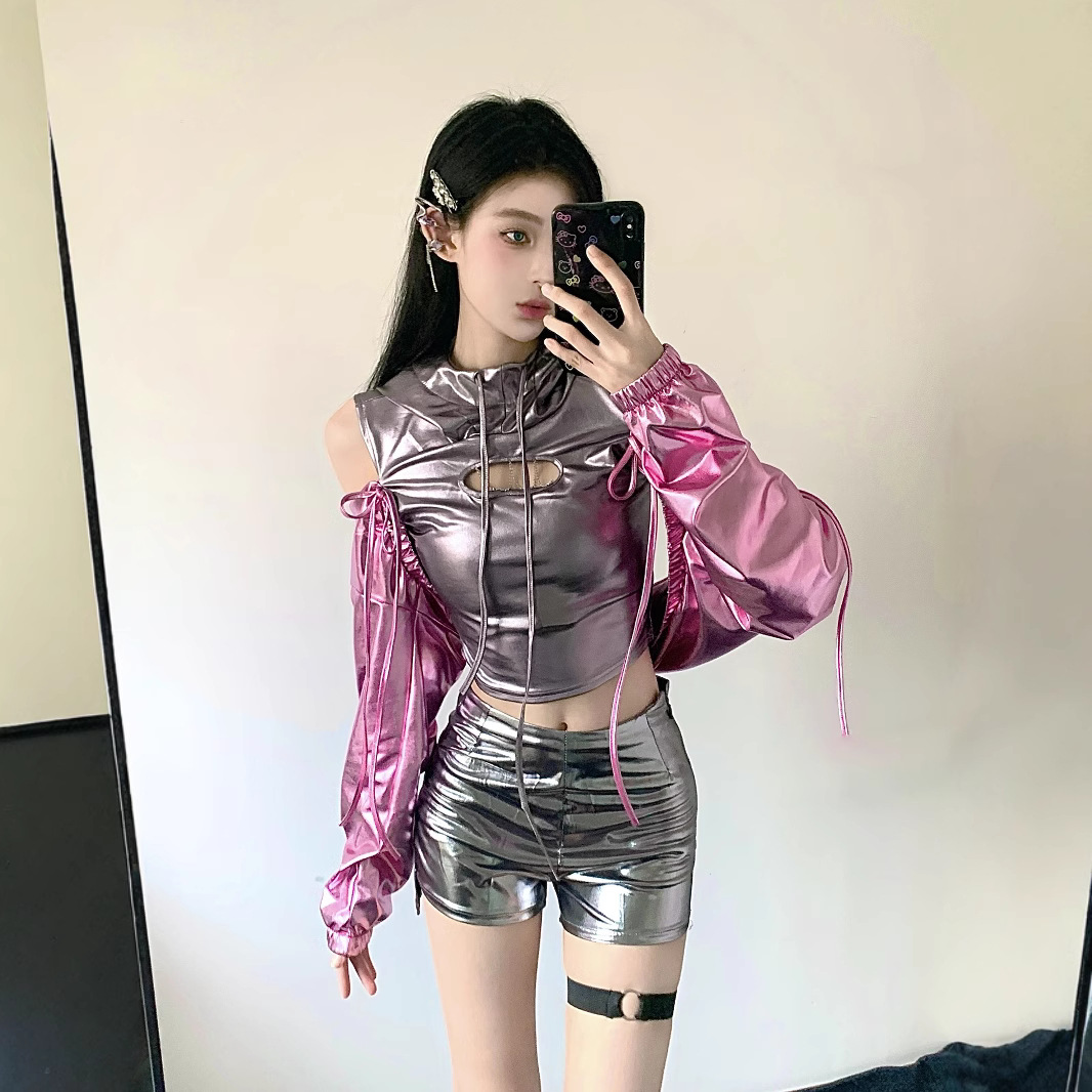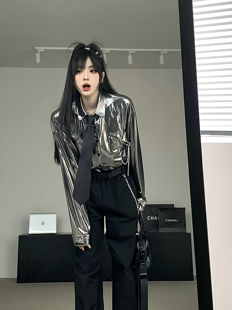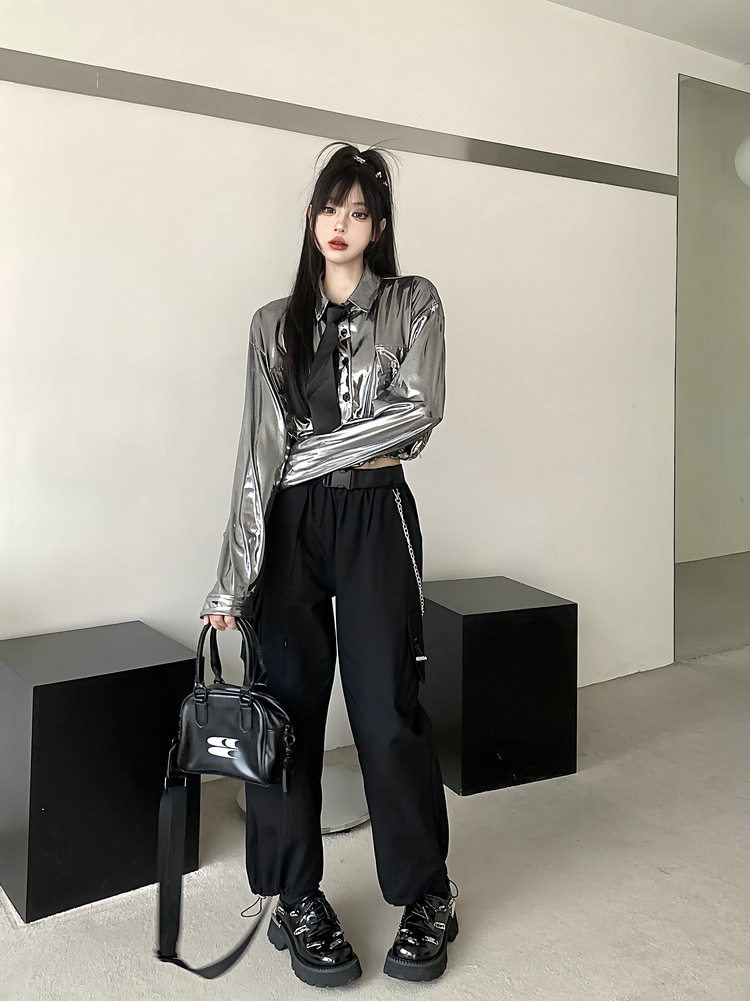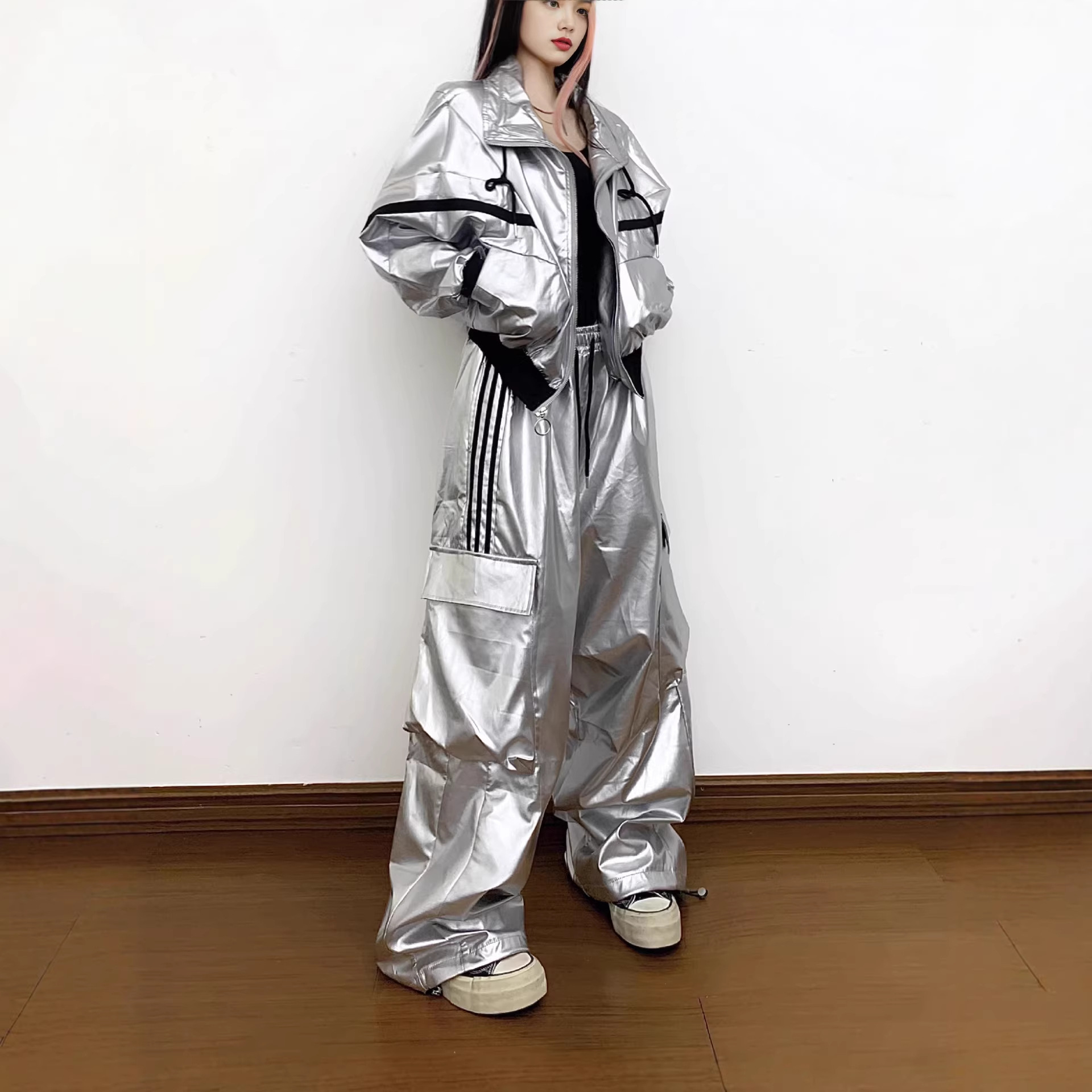 辣妹爵士舞女团银色科技感长袖上衣外套夹克嘻哈宽松工装裤套装女