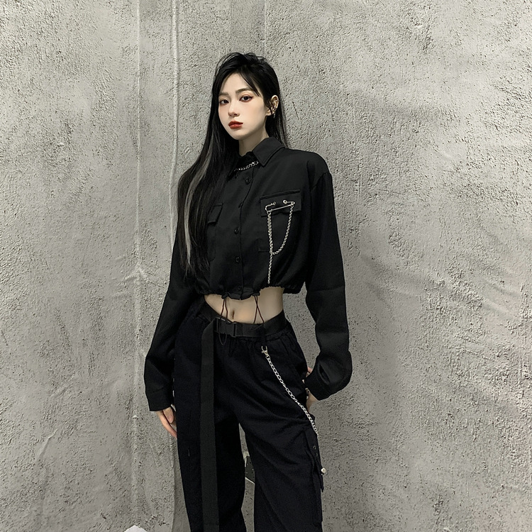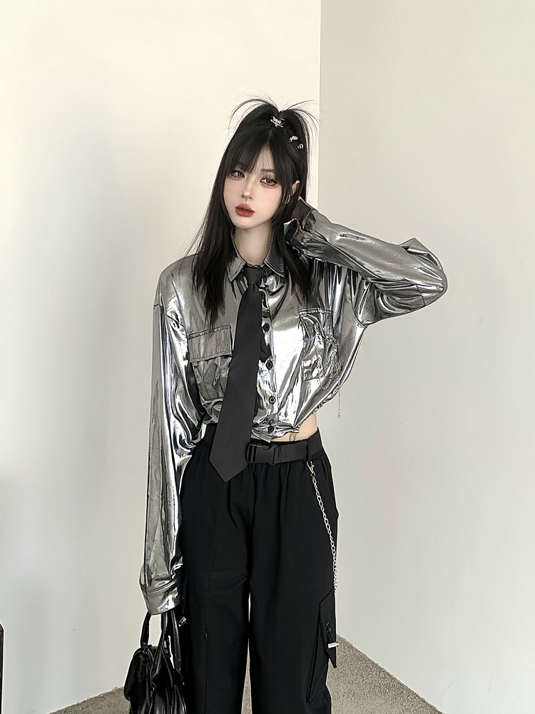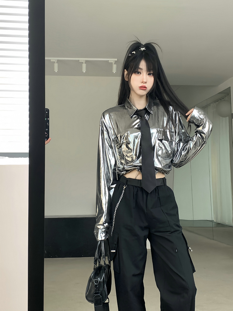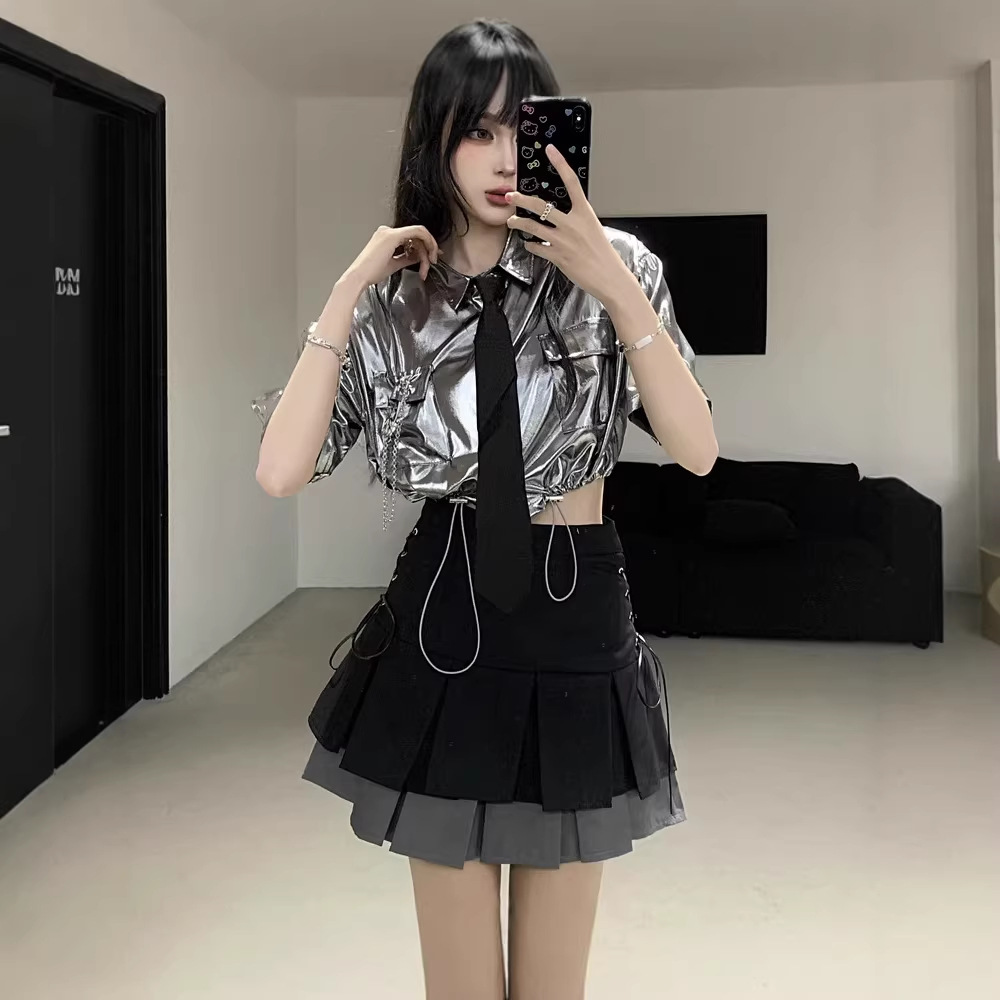 爵士舞女团银色短袖链条衬衫小众抽绳拼接百褶裙套装露腰短款领带