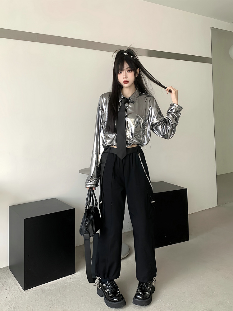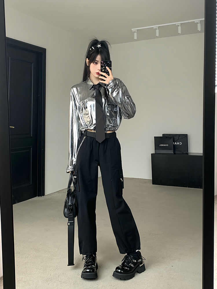 辣妹银色未来科技感长袖外套高腰嘻哈宽松工装裤爵士舞套装演出服