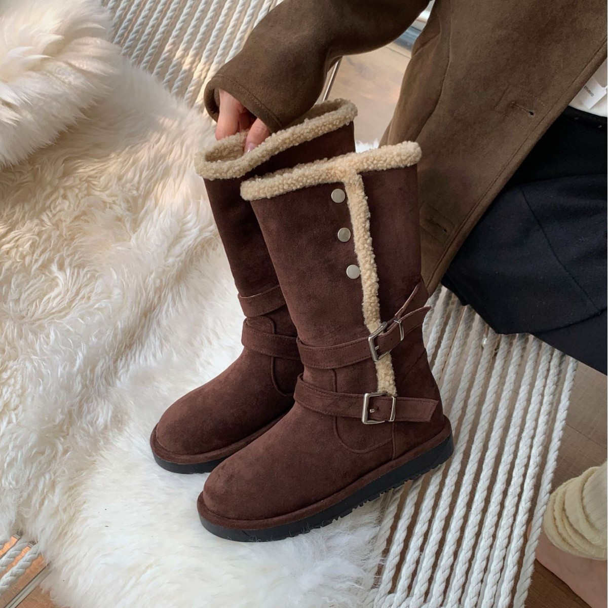 灰色铆钉厚底加绒雪地靴女2025冬季新款东北保暖棉鞋毛毛鞋短靴子