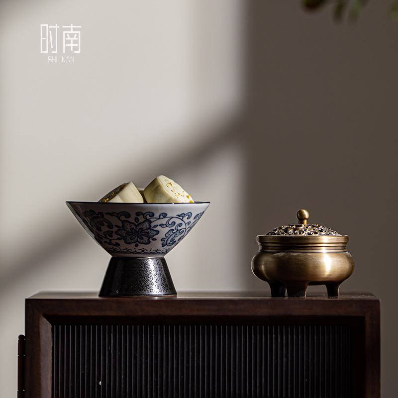 陶磁器中国式青花茶点皿レトロ高足果物菓子皿中国式茶室菓子乾燥果軽食皿