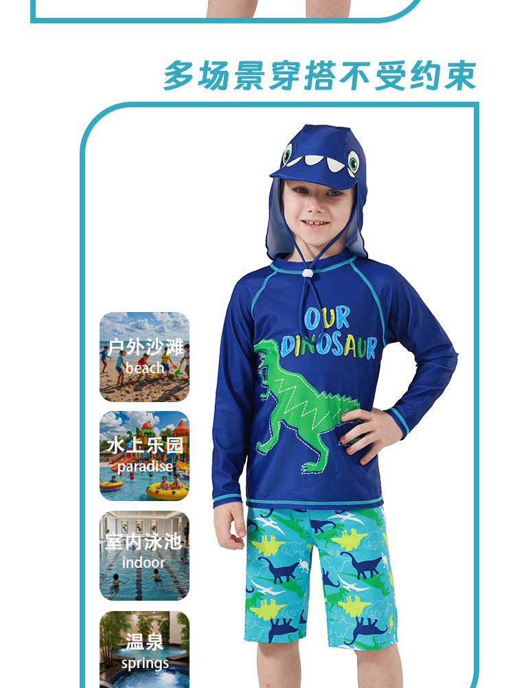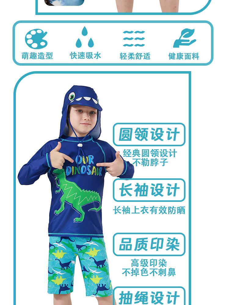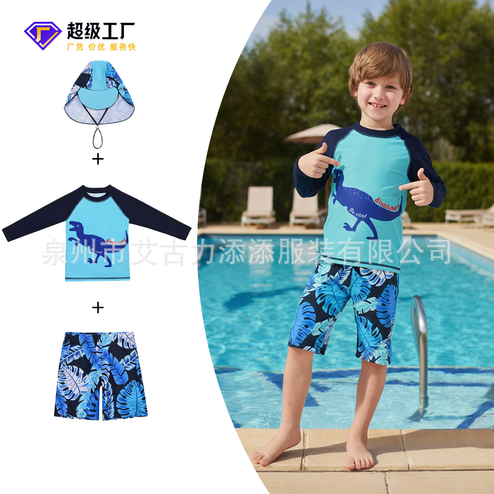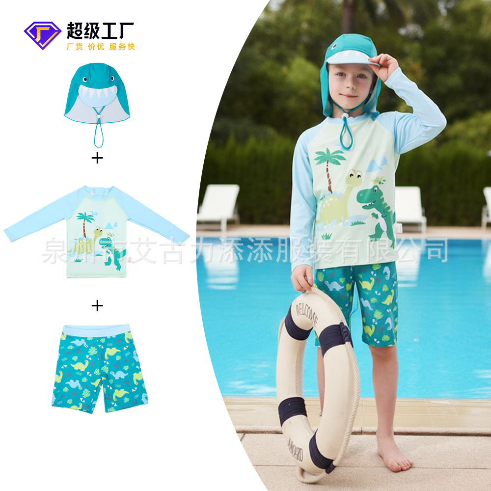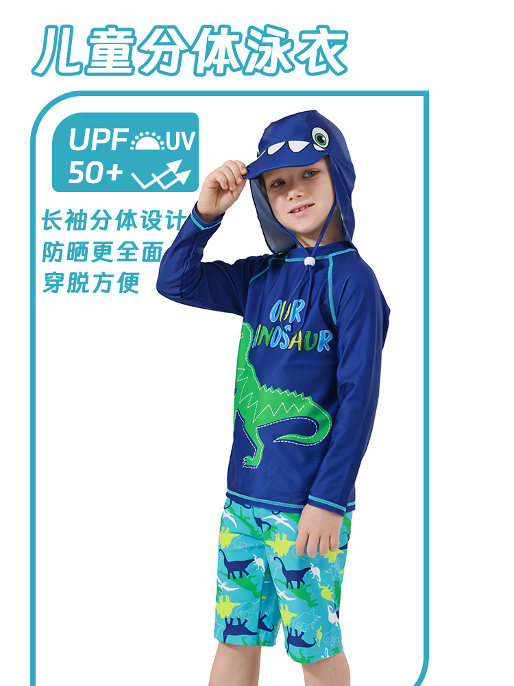 男童分体泳衣套装恐龙印花长袖防晒含泳帽中大童温泉沙滩游泳装备