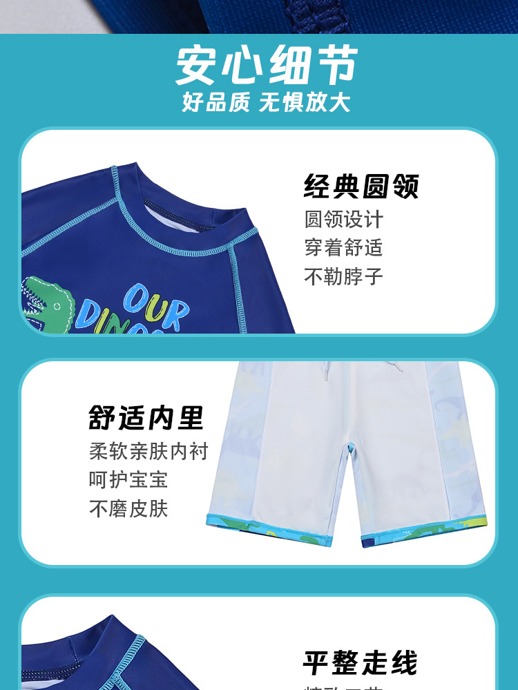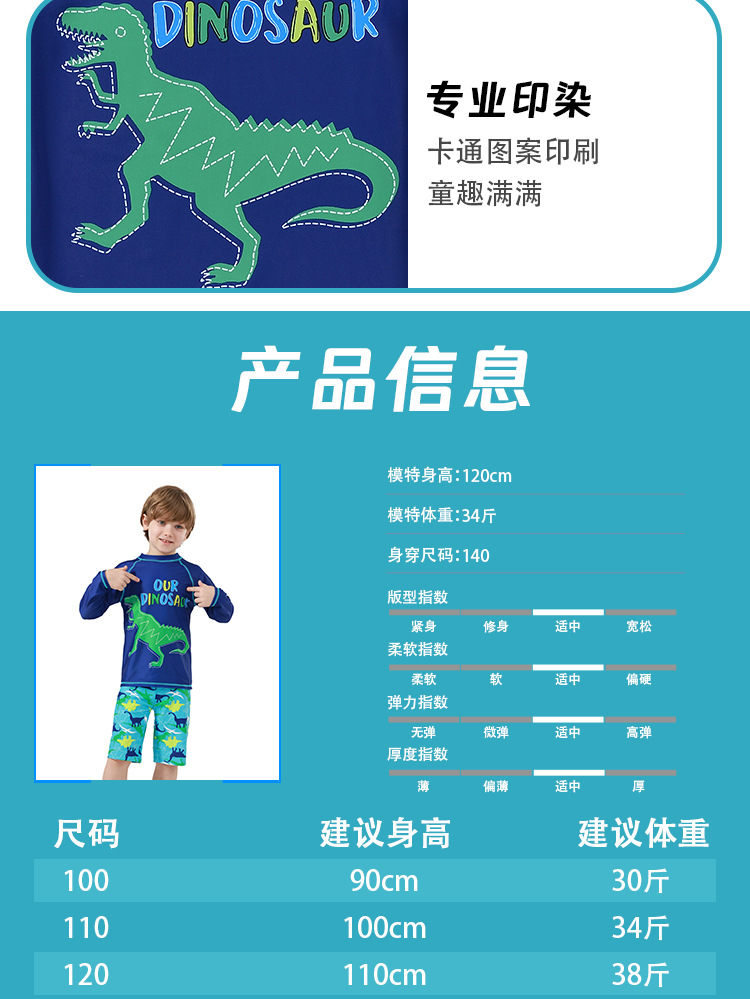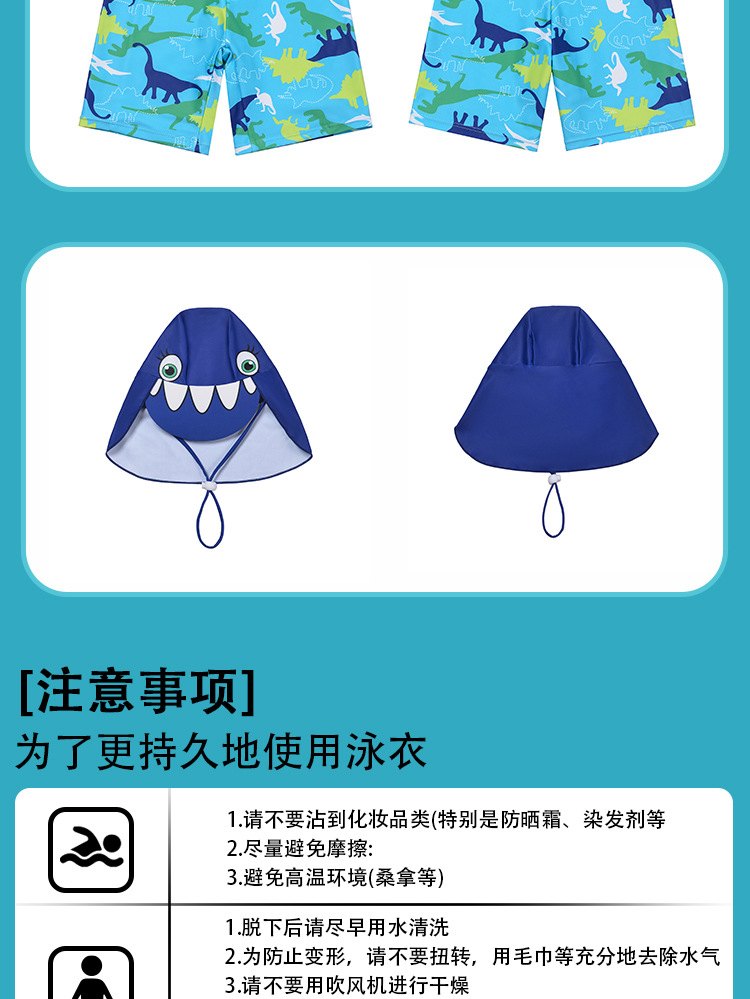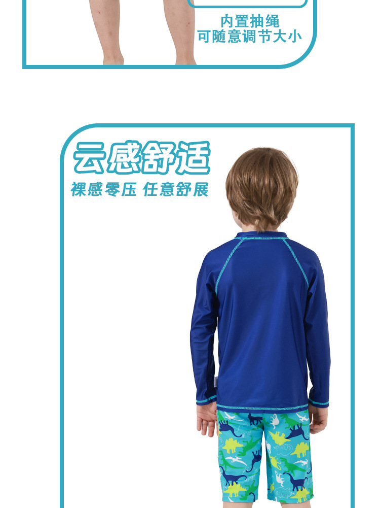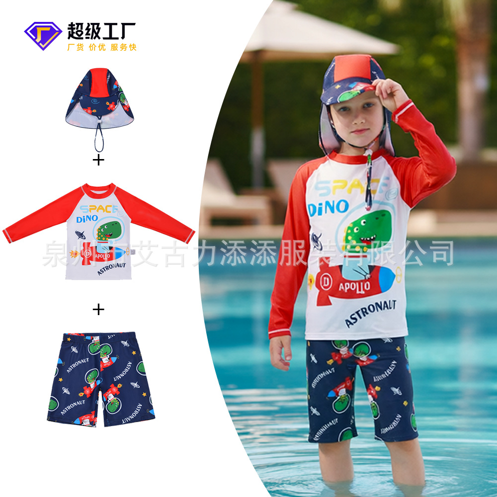 男童分体泳衣套装恐龙印花长袖防晒含泳帽中大童温泉沙滩游泳装备
