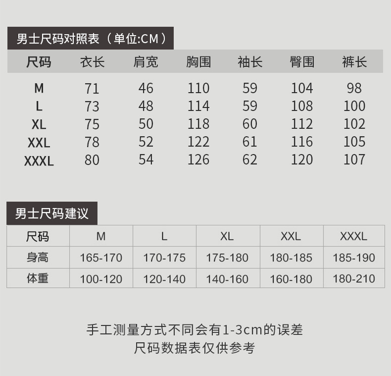 サイズ Mは100-120斤を提案する,L推奨120-140斤,XLは140 ~ 160斤を提案した,2xlは160 ~ 180斤を提案する,3xlは180-210斤を提案する