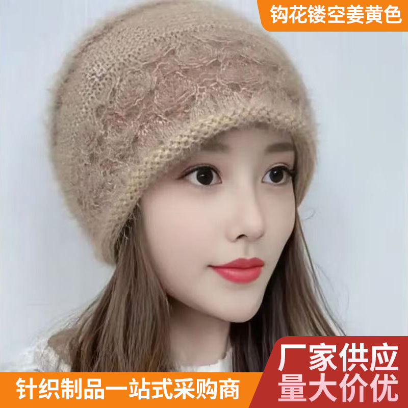 针织镂空花松鼠绒保暖小卷边堆堆护耳包头女士帽子冬季新款双层