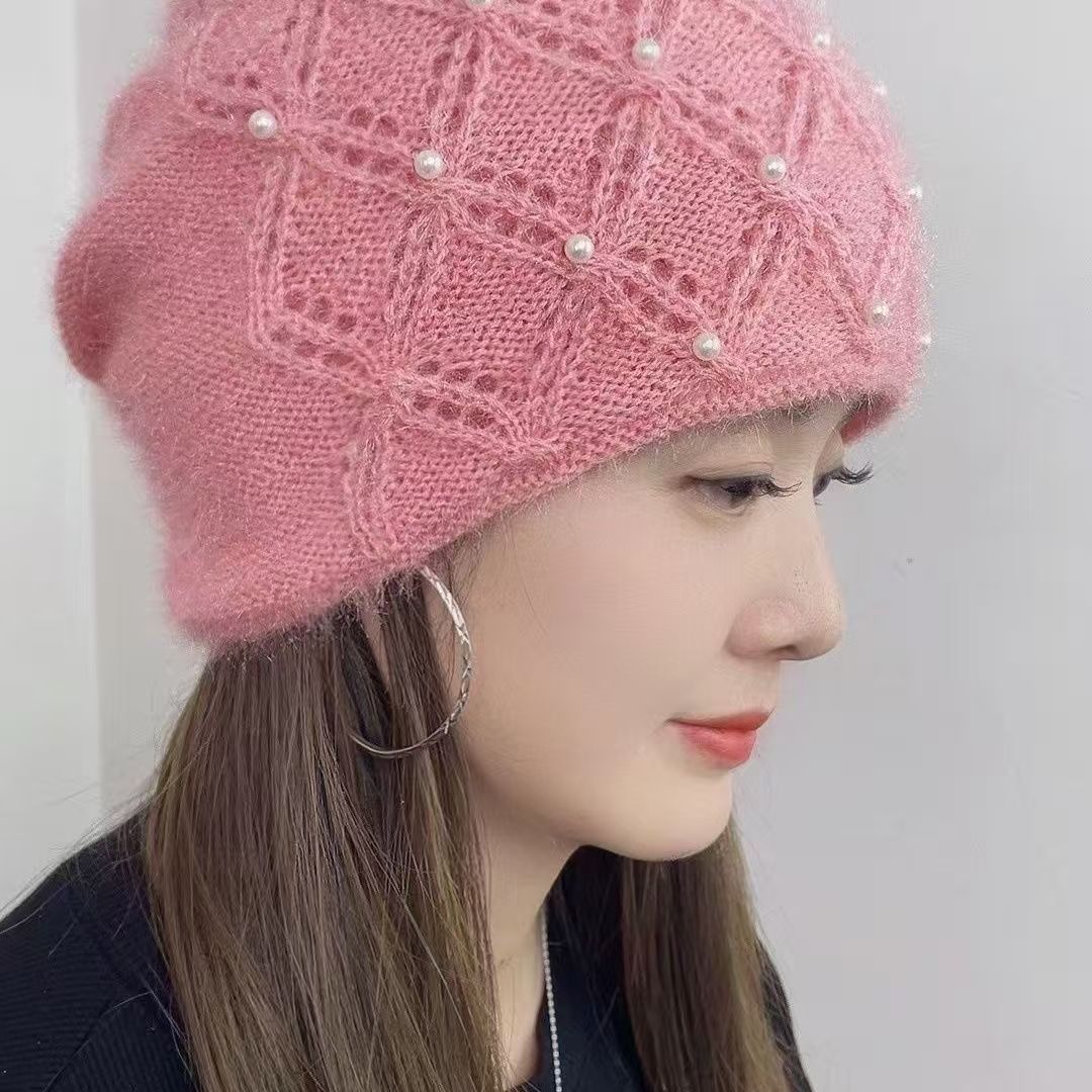 手工双层保暖针织帽时尚珍珠头套护耳包头帽堆堆帽简约冬季帽子女
