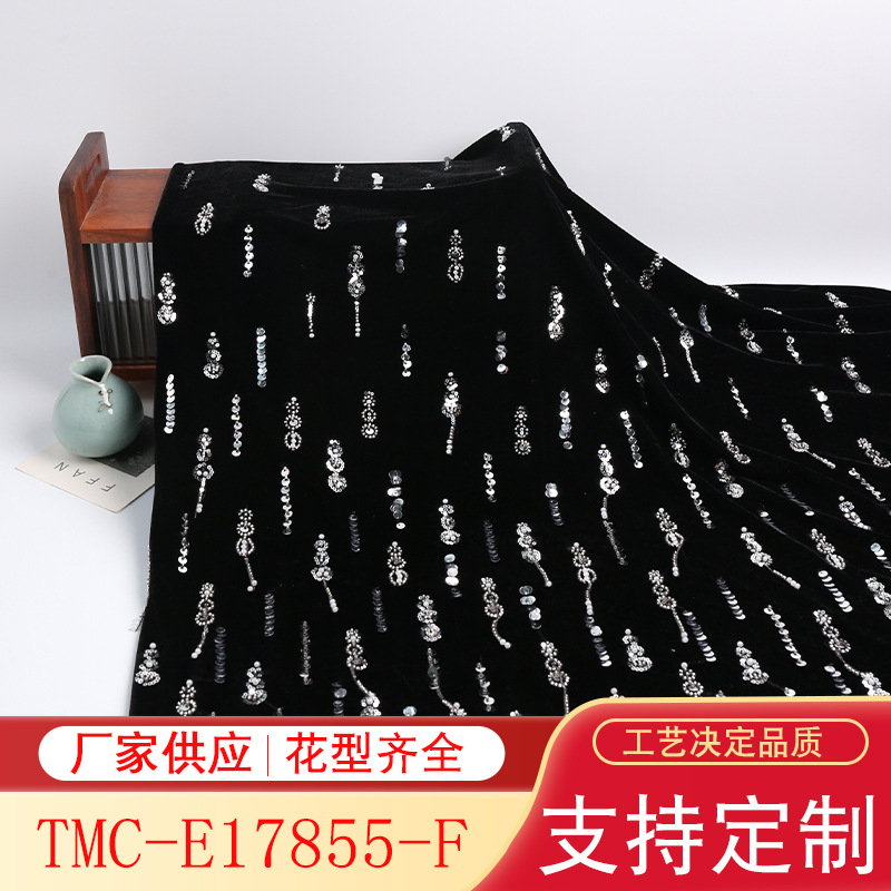 现货丝绒绣花面料重工珠管晶片盘带新中式马甲套装服装布料批发