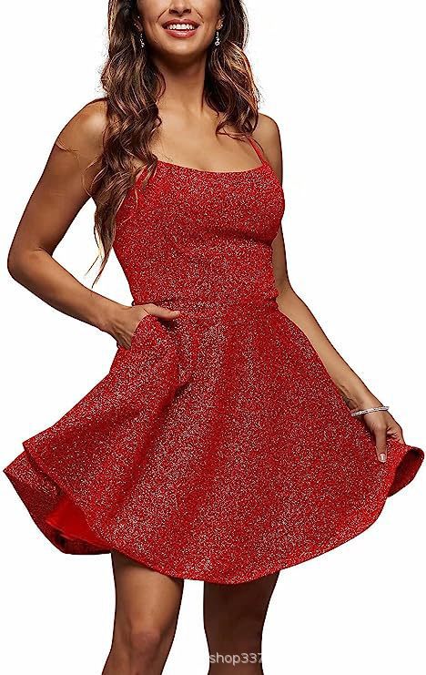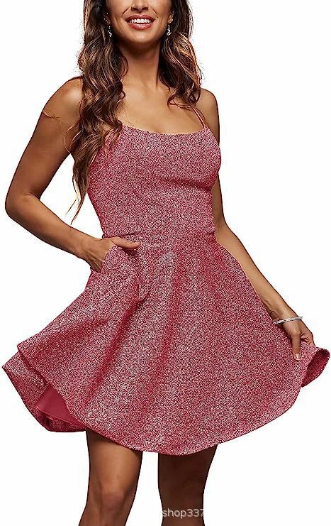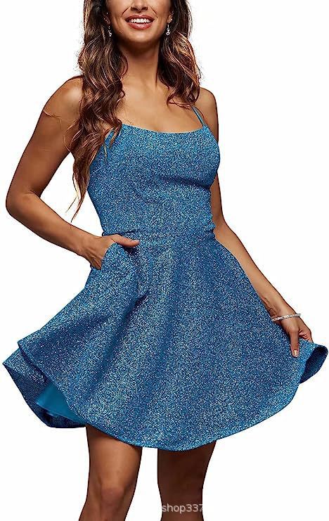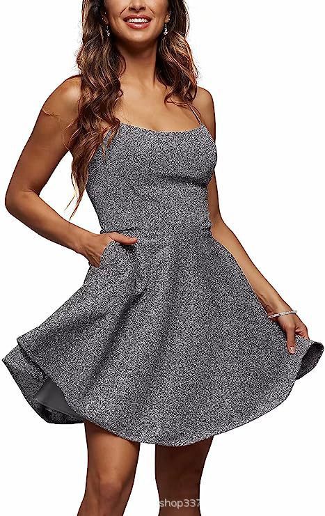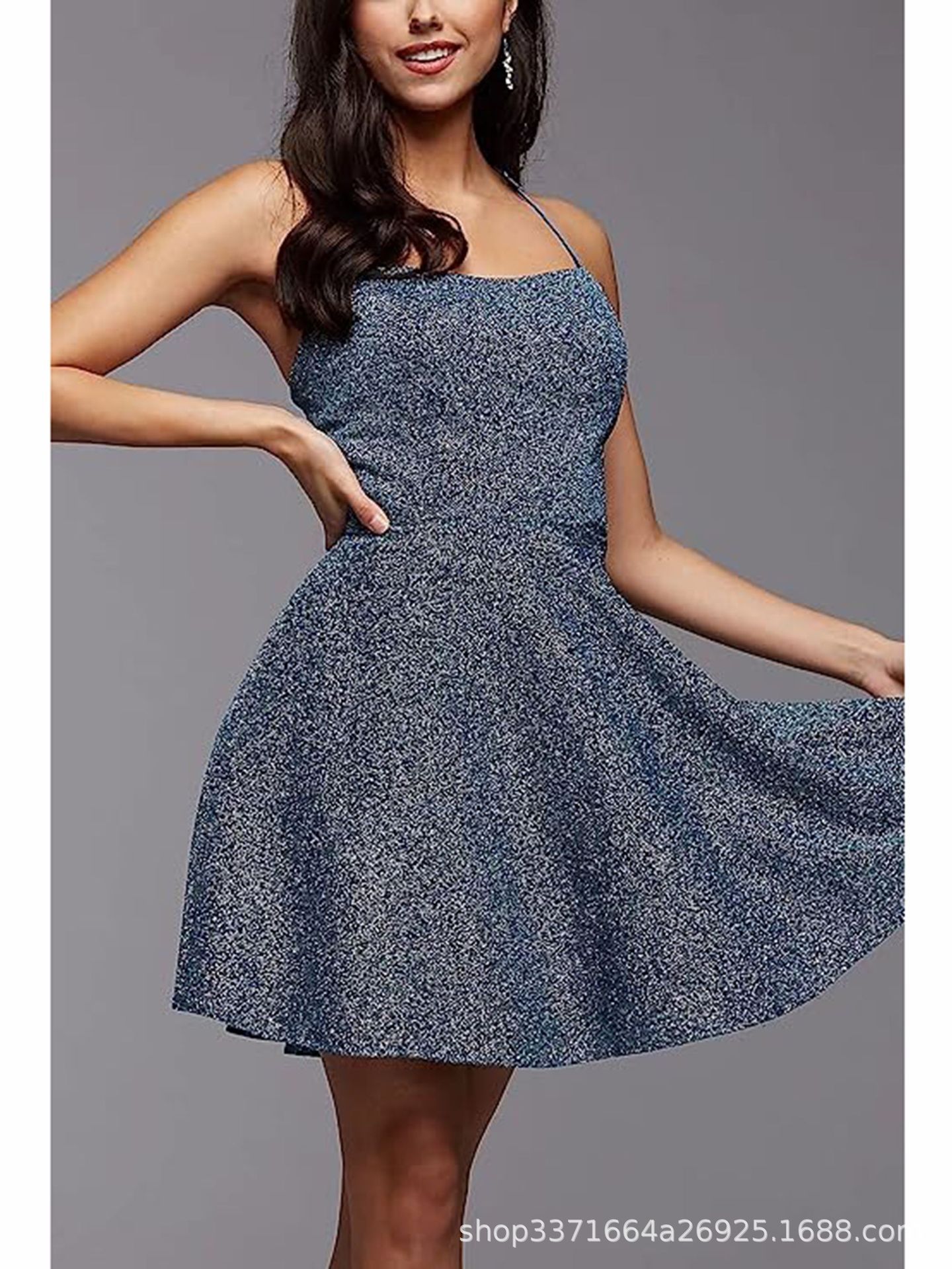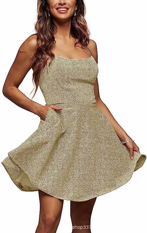 アマゾン欧米風女装2024新型u襟露背ストラップ金銀糸aがショートドレス春