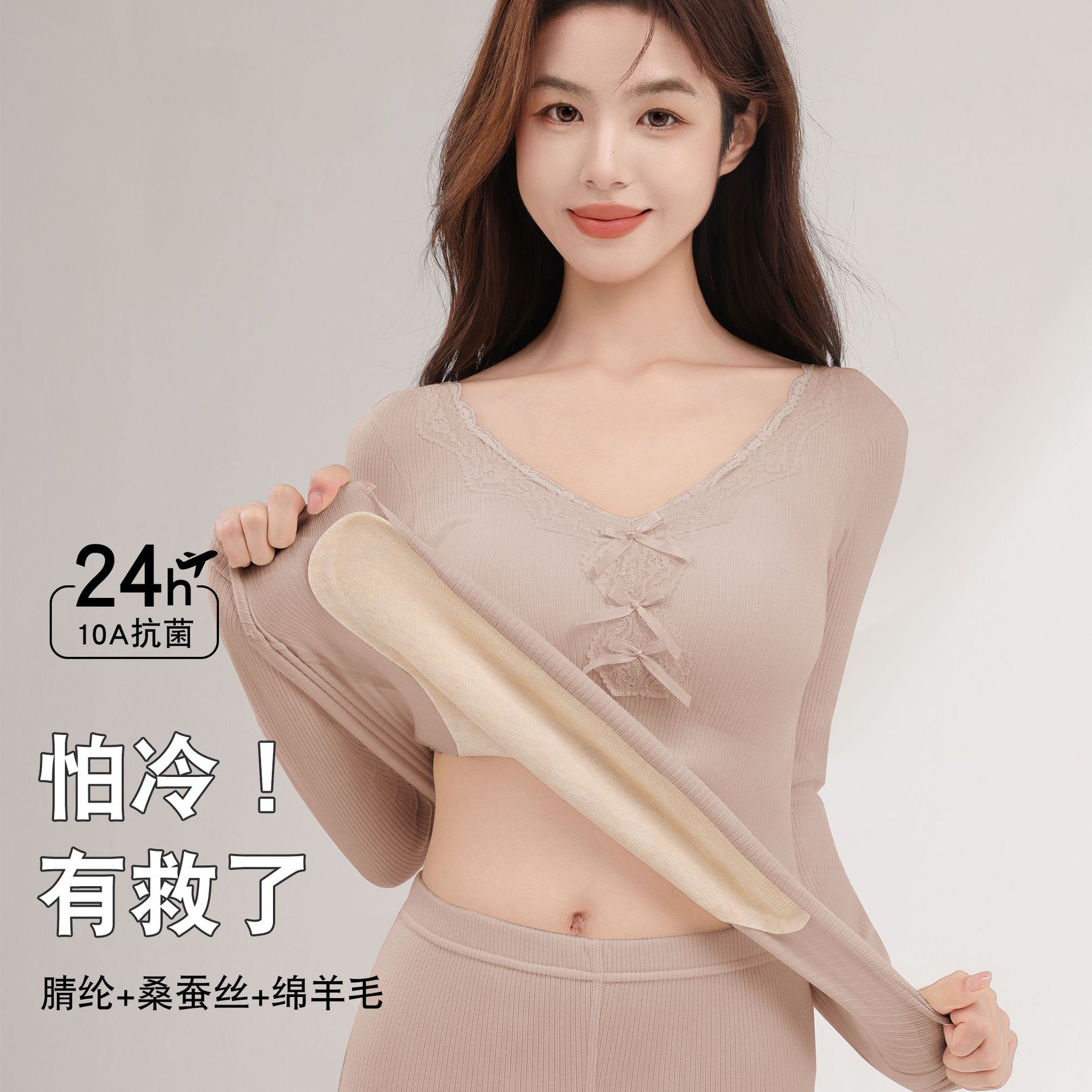 羊绒蚕丝保暖内衣女加绒秋衣秋裤套装秋冬季带胸垫打底内搭可外穿