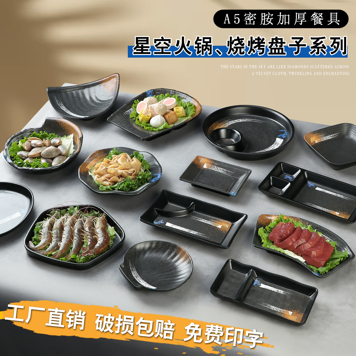 バーktv軽食凉菜皿創意黒色メラミンバーベキュー皿すき焼き鍋おかず皿プラスチック商用