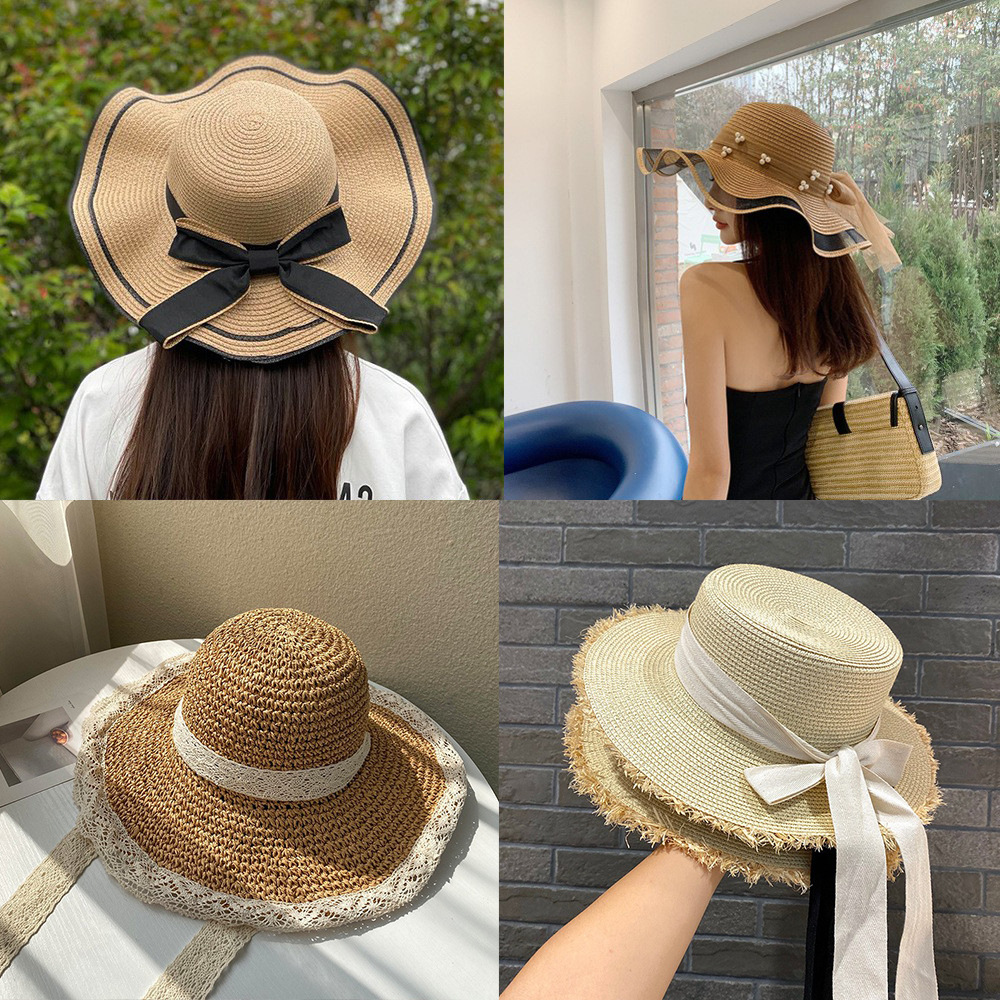 女性用蝶結び麦わら帽子、夏の屋外ビーチハット、大きなつばのチューリップサンハット、パールリボン日焼け止め帽子