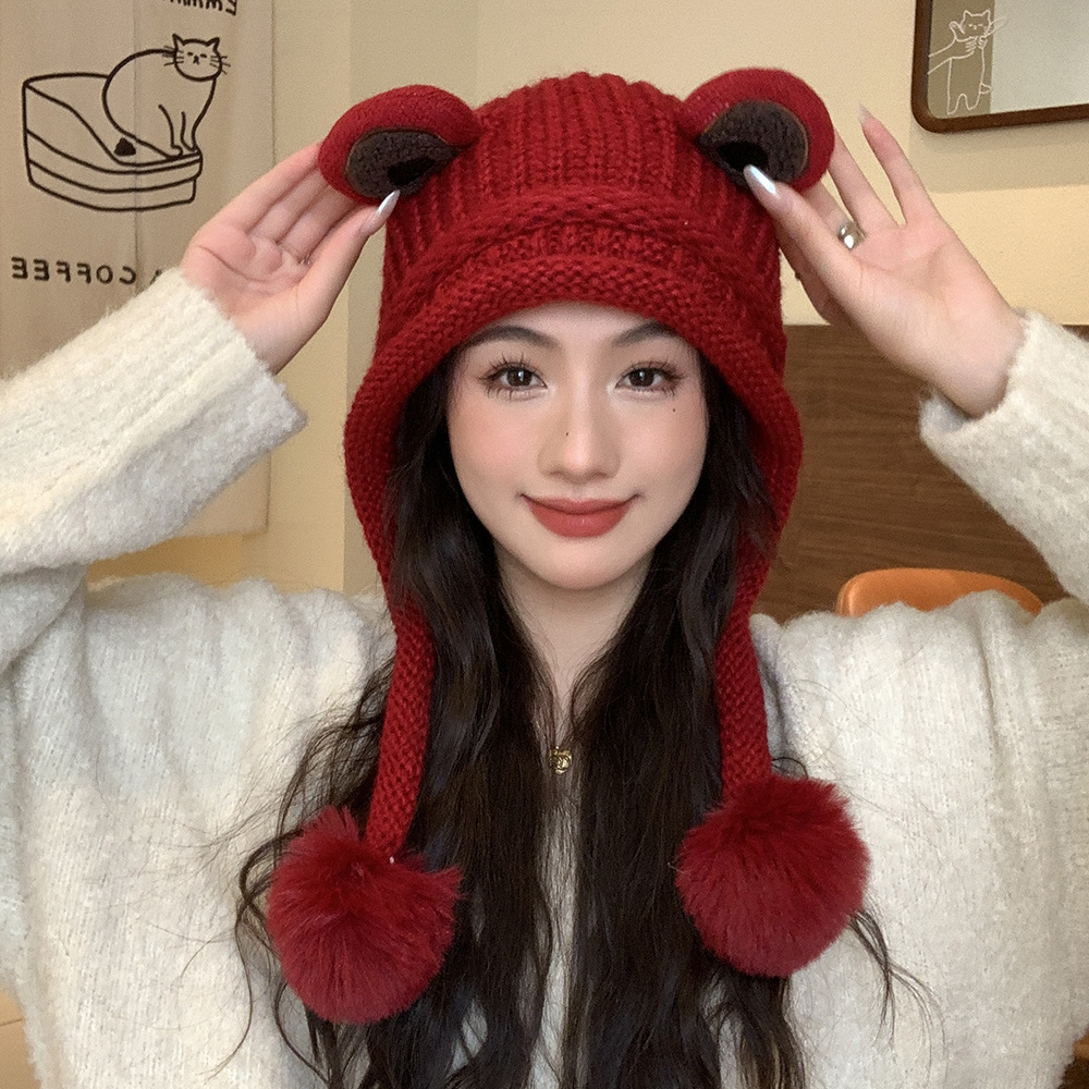 かわいい漫画カエルの毛糸帽学生毛玉ニット帽女性のアイデア冬のベルベット保温帽耳保護帽