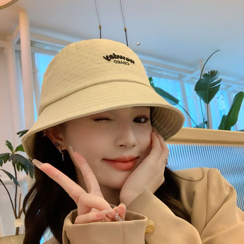 新型アルファベット刺繍漁師帽の頭の周りに顔を見せています。
