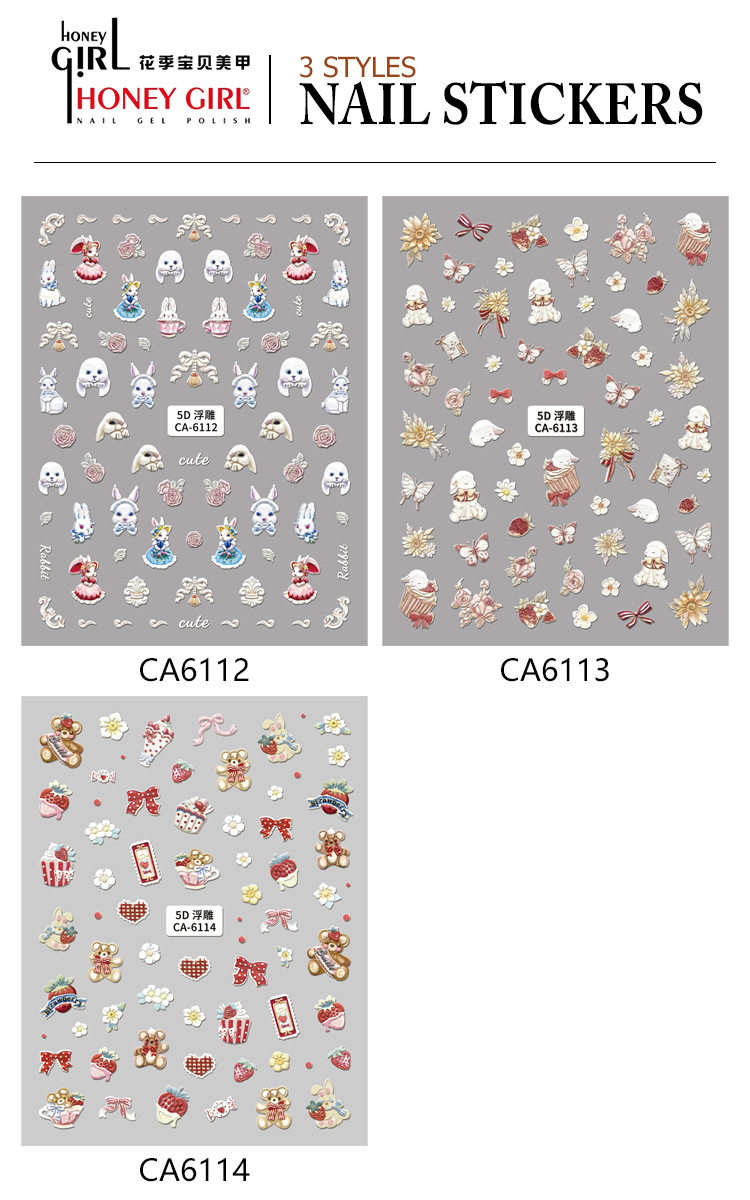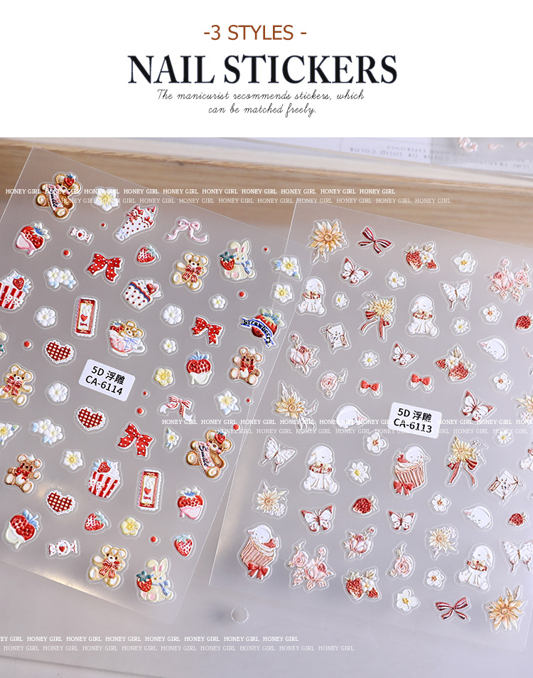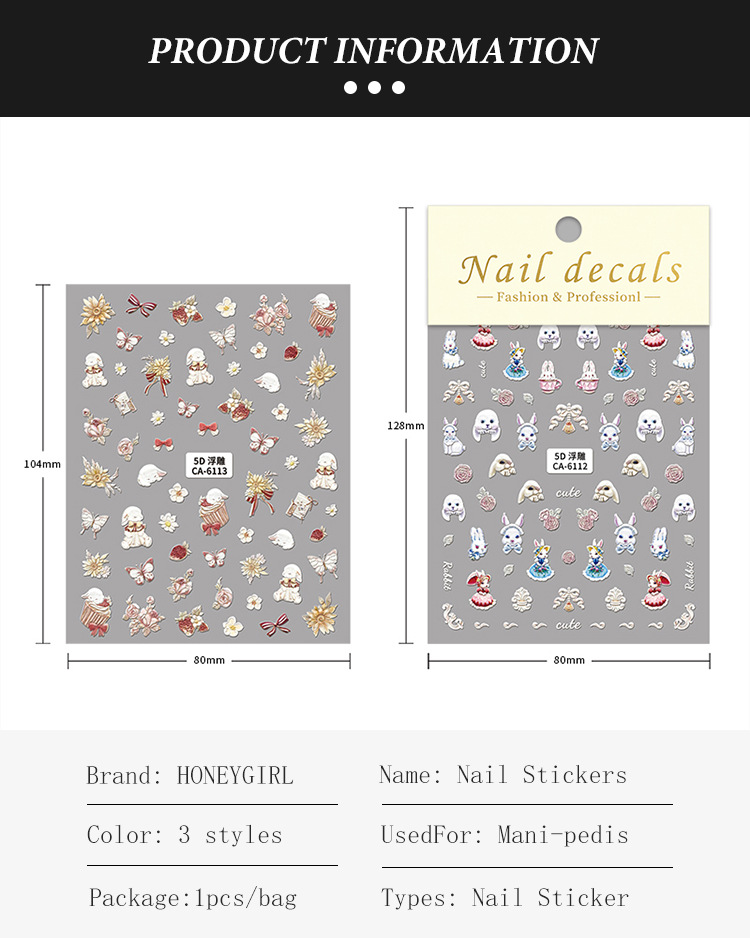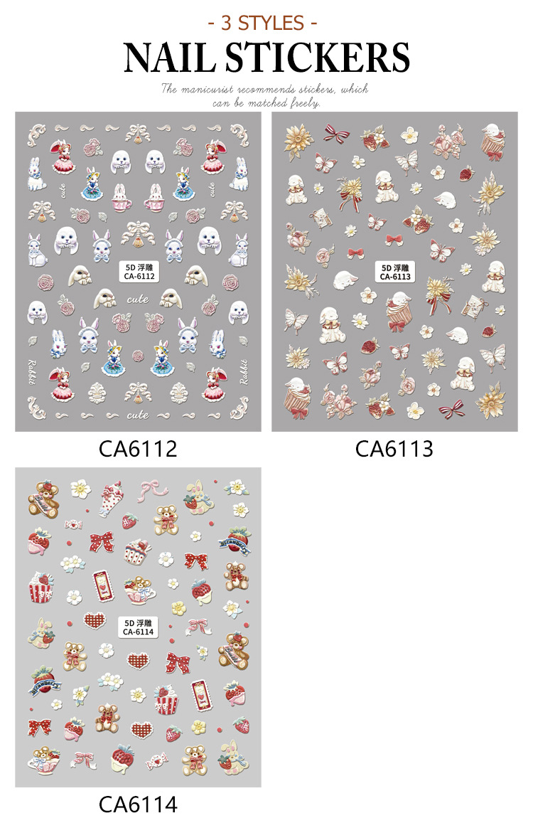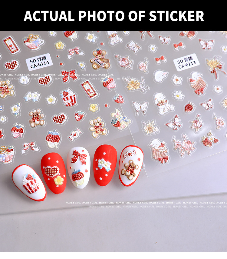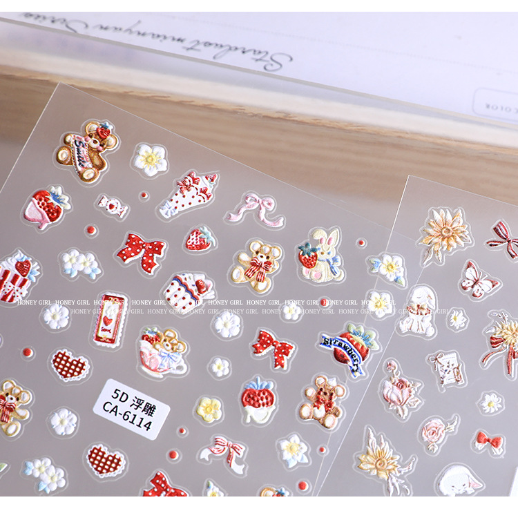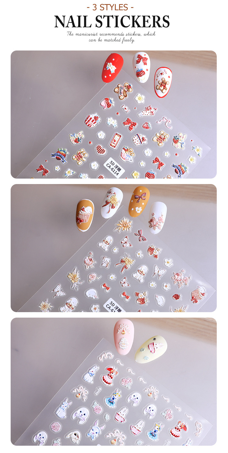 5d新型レリーフ立体ネイルステッカー漫画かわいいウサギの花蝶愛ケーキ熊蝶ネクタイ