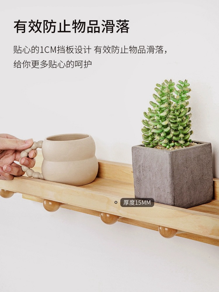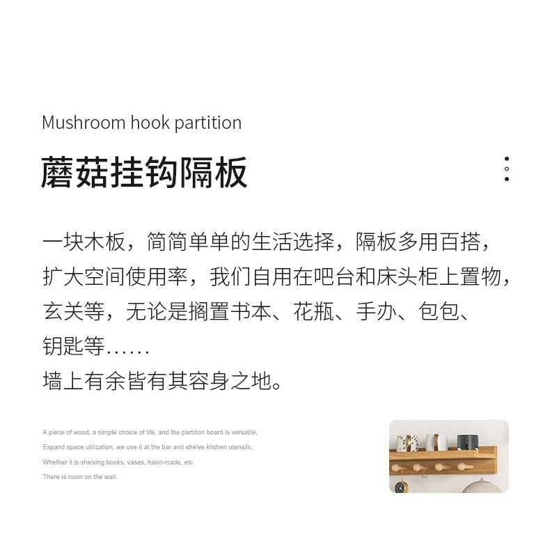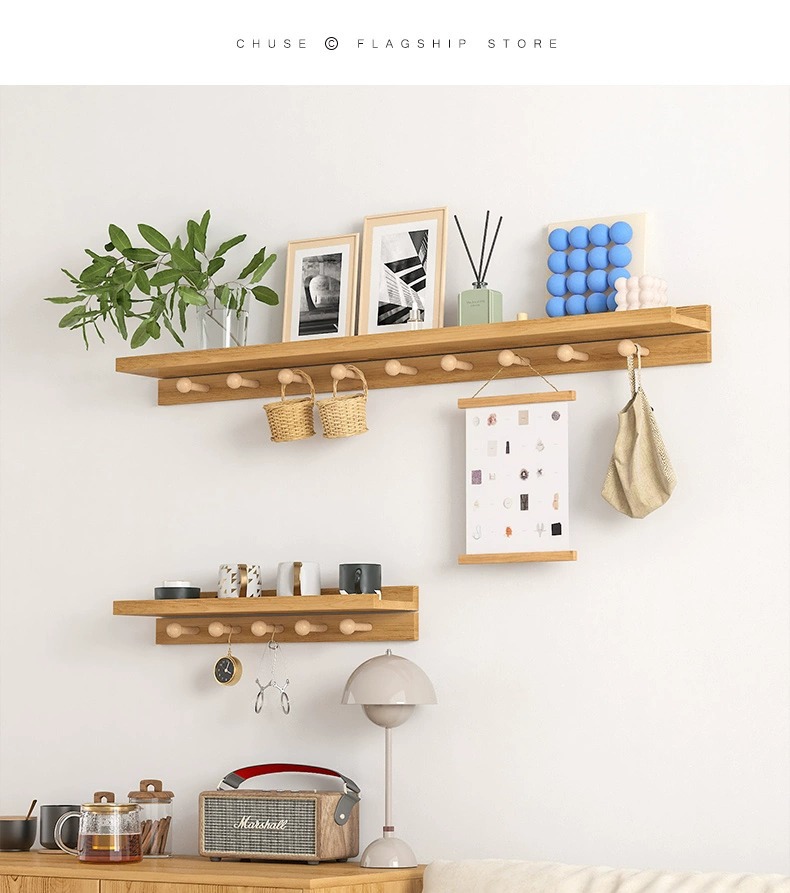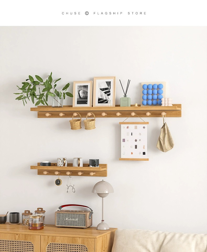 実木の壁の一字の棚の壁の物置棚はフック付きのリビングルームの板のベッドの上に飾って物置板を収納します。