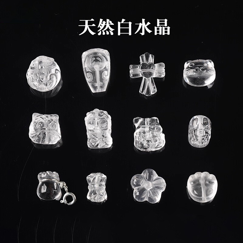 7a天然白水晶配件醒狮貔貅猫爪diy串珠饰品配件通孔雕刻件批发