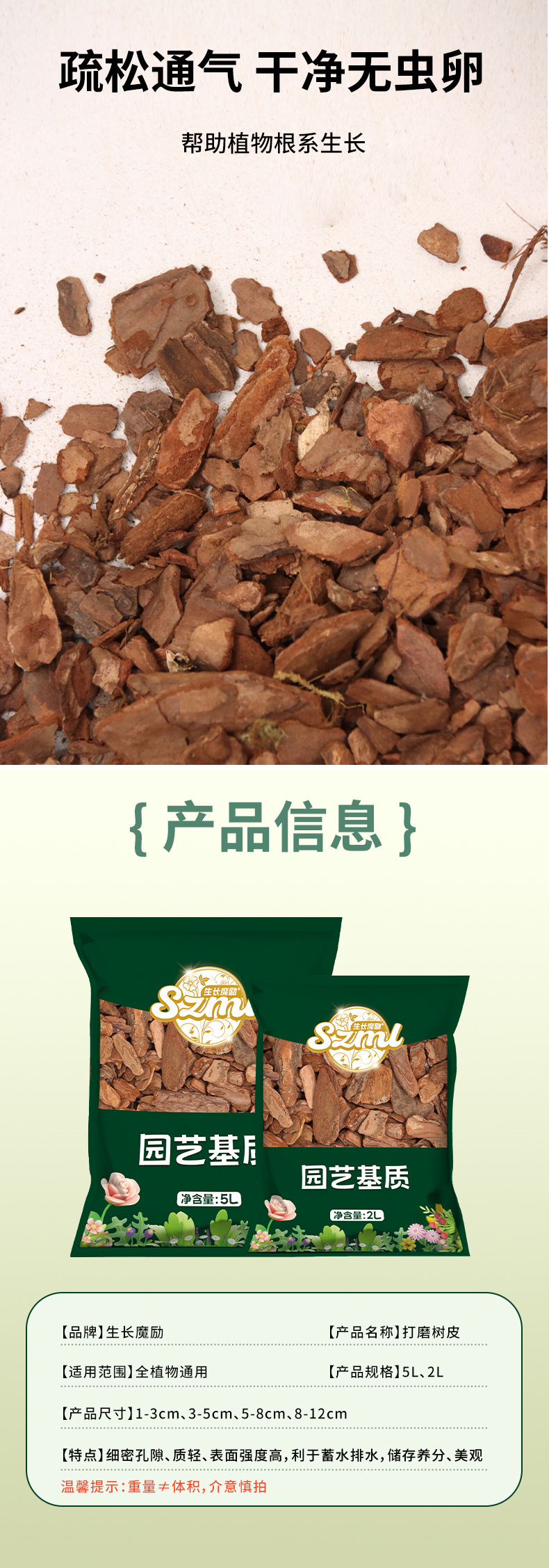 粒径仕様 成長魔励新包磨き樹皮1-3cm5L,成長魔励新包磨き樹皮3-5cm5L,成長魔励新包磨き樹皮5-8cm5L,成長魔励新包磨き樹皮8-12 cm5l